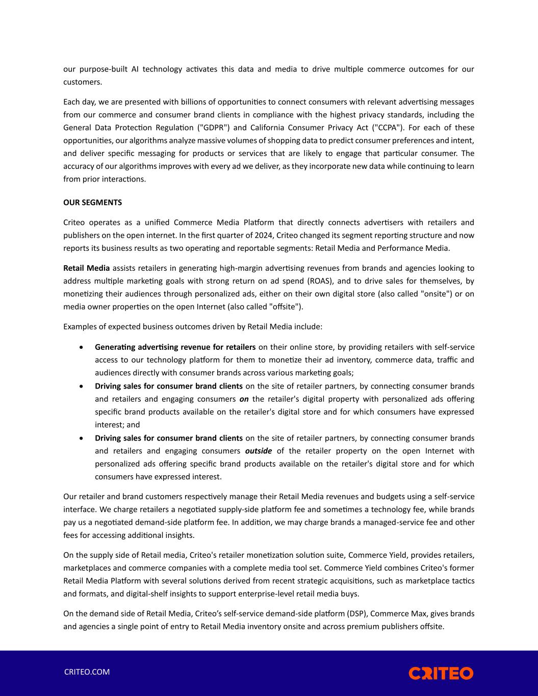 CRITEO.COM our purpose-built AI technology activates this data and media to drive multiple commerce outcomes for our customers. Each day, we are presented with billions of opportunities to connect consumers with relevant advertising messages from our commerce and consumer brand clients in compliance with the highest privacy standards, including the General Data Protection Regulation ("GDPR") and California Consumer Privacy Act ("CCPA"). For each of these opportunities, our algorithms analyze massive volumes of shopping data to predict consumer preferences and intent, and deliver specific messaging for products or services that are likely to engage that particular consumer. The accuracy of our algorithms improves with every ad we deliver, as they incorporate new data while continuing to learn from prior interactions. OUR SEGMENTS Criteo operates as a unified Commerce Media Platform that directly connects advertisers with retailers and publishers on the open internet. In the first quarter of 2024, Criteo changed its segment reporting structure and now reports its business results as two operating and reportable segments: Retail Media and Performance Media. Retail Media assists retailers in generating high-margin advertising revenues from brands and agencies looking to address multiple marketing goals with strong return on ad spend (ROAS), and to drive sales for themselves, by monetizing their audiences through personalized ads, either on their own digital store (also called "onsite") or on media owner properties on the open Internet (also called "offsite"). Examples of expected business outcomes driven by Retail Media include: • Generating advertising revenue for retailers on their online store, by providing retailers with self-service access to our technology platform for them to monetize their ad inventory, commerce data, traffic and audiences directly with consumer brands across various marketing goals; • Driving sales for consumer brand clients on the site of retailer partners, by connecting consumer brands and retailers and engaging consumers on the retailer's digital property with personalized ads offering specific brand products available on the retailer's digital store and for which consumers have expressed interest; and • Driving sales for consumer brand clients on the site of retailer partners, by connecting consumer brands and retailers and engaging consumers outside of the retailer property on the open Internet with personalized ads offering specific brand products available on the retailer's digital store and for which consumers have expressed interest. Our retailer and brand customers respectively manage their Retail Media revenues and budgets using a self-service interface. We charge retailers a negotiated supply-side platform fee and sometimes a technology fee, while brands pay us a negotiated demand-side platform fee. In addition, we may charge brands a managed-service fee and other fees for accessing additional insights. On the supply side of Retail media, Criteo's retailer monetization solution suite, Commerce Yield, provides retailers, marketplaces and commerce companies with a complete media tool set. Commerce Yield combines Criteo's former Retail Media Platform with several solutions derived from recent strategic acquisitions, such as marketplace tactics and formats, and digital-shelf insights to support enterprise-level retail media buys. On the demand side of Retail Media, Criteo’s self-service demand-side platform (DSP), Commerce Max, gives brands and agencies a single point of entry to Retail Media inventory onsite and across premium publishers offsite.