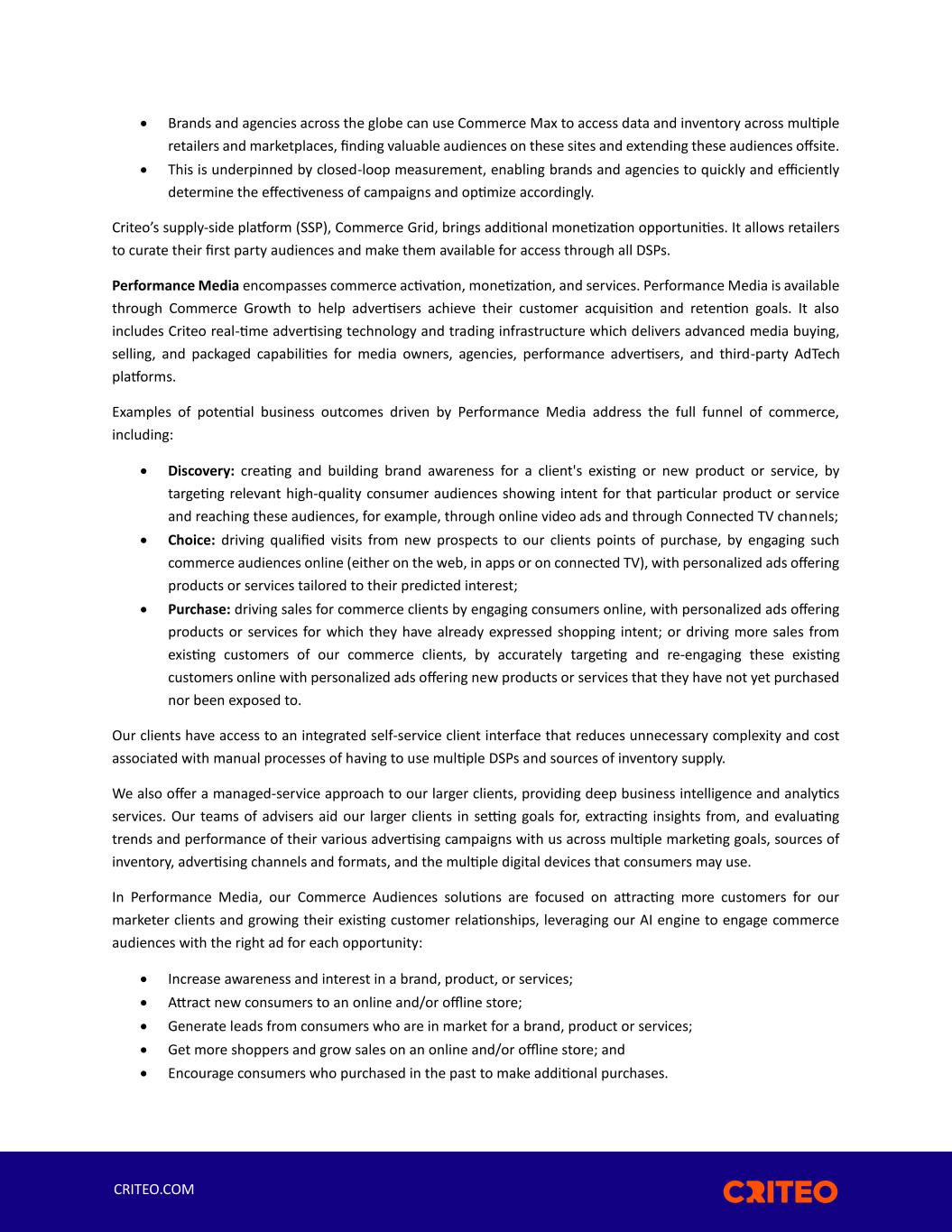 CRITEO.COM • Brands and agencies across the globe can use Commerce Max to access data and inventory across multiple retailers and marketplaces, finding valuable audiences on these sites and extending these audiences offsite. • This is underpinned by closed-loop measurement, enabling brands and agencies to quickly and efficiently determine the effectiveness of campaigns and optimize accordingly. Criteo’s supply-side platform (SSP), Commerce Grid, brings additional monetization opportunities. It allows retailers to curate their first party audiences and make them available for access through all DSPs. Performance Media encompasses commerce activation, monetization, and services. Performance Media is available through Commerce Growth to help advertisers achieve their customer acquisition and retention goals. It also includes Criteo real-time advertising technology and trading infrastructure which delivers advanced media buying, selling, and packaged capabilities for media owners, agencies, performance advertisers, and third-party AdTech platforms. Examples of potential business outcomes driven by Performance Media address the full funnel of commerce, including: • Discovery: creating and building brand awareness for a client's existing or new product or service, by targeting relevant high-quality consumer audiences showing intent for that particular product or service and reaching these audiences, for example, through online video ads and through Connected TV channels; • Choice: driving qualified visits from new prospects to our clients points of purchase, by engaging such commerce audiences online (either on the web, in apps or on connected TV), with personalized ads offering products or services tailored to their predicted interest; • Purchase: driving sales for commerce clients by engaging consumers online, with personalized ads offering products or services for which they have already expressed shopping intent; or driving more sales from existing customers of our commerce clients, by accurately targeting and re-engaging these existing customers online with personalized ads offering new products or services that they have not yet purchased nor been exposed to. Our clients have access to an integrated self-service client interface that reduces unnecessary complexity and cost associated with manual processes of having to use multiple DSPs and sources of inventory supply. We also offer a managed-service approach to our larger clients, providing deep business intelligence and analytics services. Our teams of advisers aid our larger clients in setting goals for, extracting insights from, and evaluating trends and performance of their various advertising campaigns with us across multiple marketing goals, sources of inventory, advertising channels and formats, and the multiple digital devices that consumers may use. In Performance Media, our Commerce Audiences solutions are focused on attracting more customers for our marketer clients and growing their existing customer relationships, leveraging our AI engine to engage commerce audiences with the right ad for each opportunity: • Increase awareness and interest in a brand, product, or services; • Attract new consumers to an online and/or offline store; • Generate leads from consumers who are in market for a brand, product or services; • Get more shoppers and grow sales on an online and/or offline store; and • Encourage consumers who purchased in the past to make additional purchases.