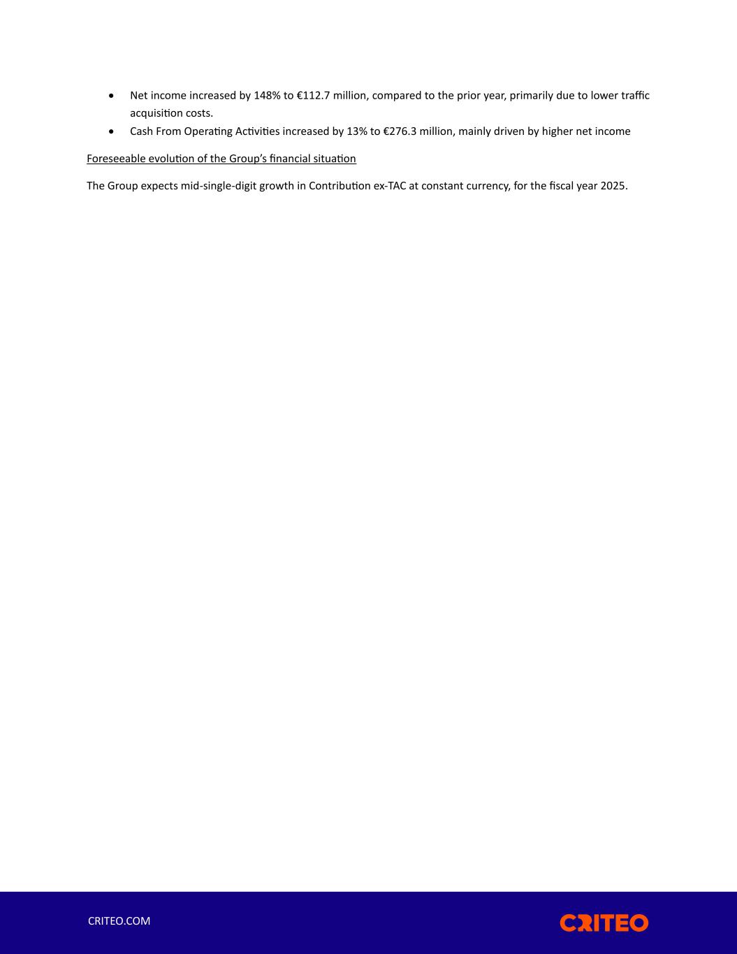 CRITEO.COM • Net income increased by 148% to €112.7 million, compared to the prior year, primarily due to lower traffic acquisition costs. • Cash From Operating Activities increased by 13% to €276.3 million, mainly driven by higher net income Foreseeable evolution of the Group’s financial situation The Group expects mid-single-digit growth in Contribution ex-TAC at constant currency, for the fiscal year 2025.