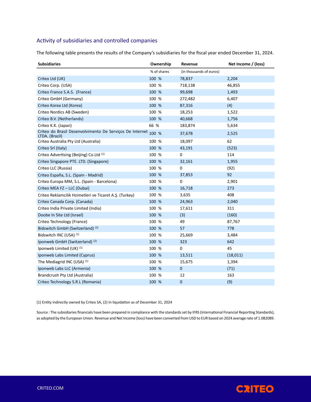CRITEO.COM Activity of subsidiaries and controlled companies The following table presents the results of the Company’s subsidiaries for the fiscal year ended December 31, 2024. Subsidiaries Ownership Revenue Net Income / (loss) % of shares (in thousands of euros) Criteo Ltd (UK) 100 % 78,837 2,204 Criteo Corp. (USA) 100 % 718,138 46,855 Criteo France S.A.S. (France) 100 % 99,698 1,493 Criteo GmbH (Germany) 100 % 272,482 6,407 Criteo Korea Ltd (Korea) 100 % 87,316 (4) Criteo Nordics AB (Sweden) 100 % 18,253 1,522 Criteo B.V. (Netherlands) 100 % 40,668 1,756 Criteo K.K. (Japan) 66 % 183,874 5,634 Criteo do Brasil Desenvolvimento De Serviços De Internet LTDA. (Brazil) 100 % 37,678 2,525 Criteo Australia Pty Ltd (Australia) 100 % 18,097 62 Criteo Srl (Italy) 100 % 43,191 (523) Criteo Advertising (Beijing) Co.Ltd (1) 100 % 0 114 Criteo Singapore PTE. LTD. (Singapore) 100 % 32,161 1,955 Criteo LLC (Russia) 100 % 0 (92) Criteo España, S.L. (Spain - Madrid) 100 % 37,853 92 Criteo Europa MM, S.L. (Spain - Barcelona) 100 % 0 2,901 Criteo MEA FZ – LLC (Dubai) 100 % 16,718 273 Criteo Reklamcilik Hzimetleri ve Ticaret A.Ş. (Turkey) 100 % 3,635 408 Criteo Canada Corp. (Canada) 100 % 24,963 2,040 Criteo India Private Limited (India) 100 % 17,611 311 Doobe In Site Ltd (Israel) 100 % (3) (160) Criteo Technology (France) 100 % 49 87,767 Bidswitch GmbH (Switzerland) (2) 100 % 57 778 Bidswitch INC (USA) (1) 100 % 25,669 3,484 Iponweb GmbH (Switzerland) (2) 100 % 323 642 Iponweb Limited (UK) (1) 100 % 0 45 Iponweb Labs Limited (Cyprus) 100 % 13,511 (18,011) The Mediagrid INC (USA) (1) 100 % 15,675 1,394 Iponweb Labs LLC (Armenia) 100 % 0 (71) Brandcrush Pty Ltd (Australia) 100 % 12 163 Criteo Technology S.R.L (Romania) 100 % 0 (9) (1) Entity indirectly owned by Criteo SA, (2) In liquidation as of December 31, 2024 Source : The subsidiaries financials have been prepared in compliance with the standards set by IFRS (International Financial Reporting Standards), as adopted by the European Union. Revenue and Net Income (loss) have been converted from USD to EUR based on 2024 average rate of 1.082089.