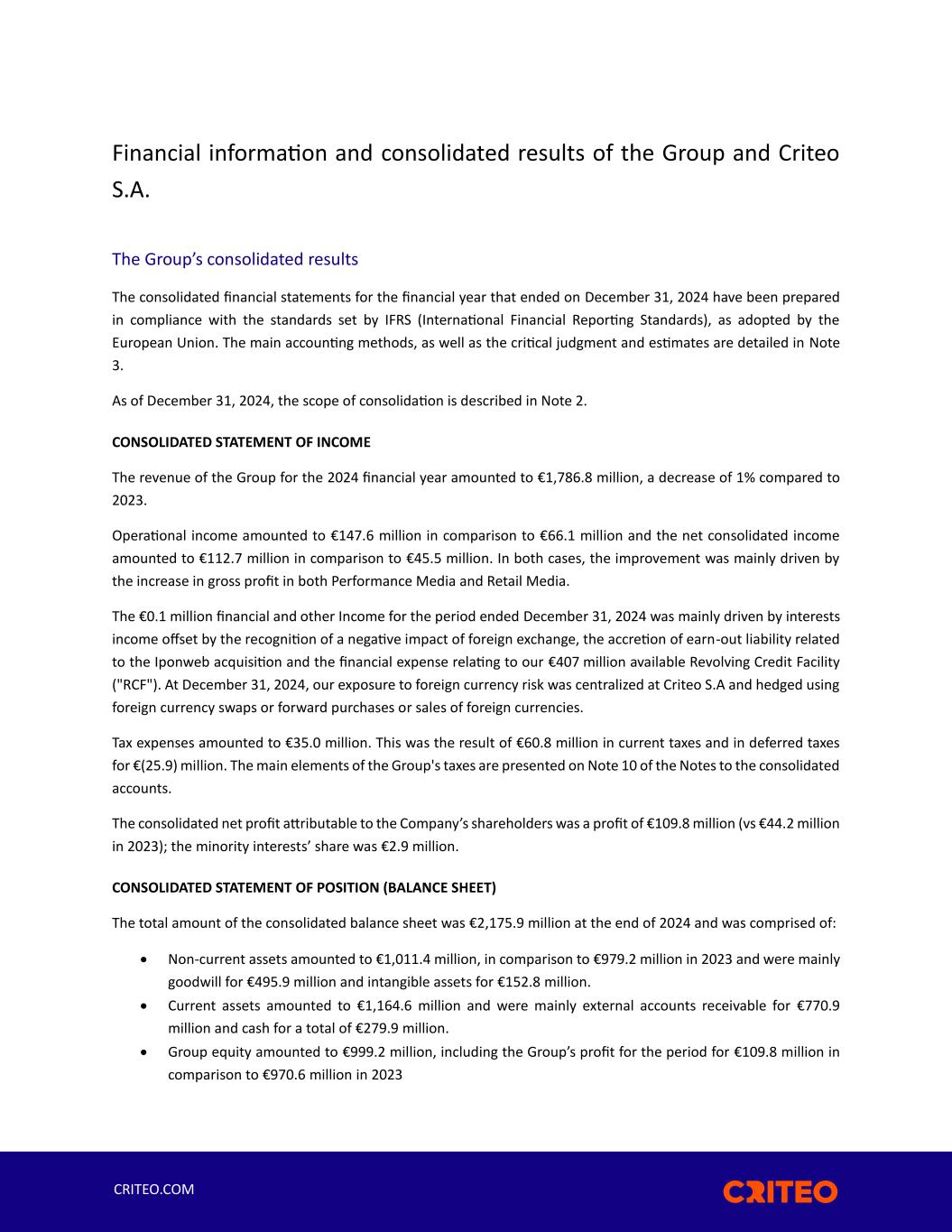 CRITEO.COM Financial information and consolidated results of the Group and Criteo S.A. The Group’s consolidated results The consolidated financial statements for the financial year that ended on December 31, 2024 have been prepared in compliance with the standards set by IFRS (International Financial Reporting Standards), as adopted by the European Union. The main accounting methods, as well as the critical judgment and estimates are detailed in Note 3. As of December 31, 2024, the scope of consolidation is described in Note 2. CONSOLIDATED STATEMENT OF INCOME The revenue of the Group for the 2024 financial year amounted to €1,786.8 million, a decrease of 1% compared to 2023. Operational income amounted to €147.6 million in comparison to €66.1 million and the net consolidated income amounted to €112.7 million in comparison to €45.5 million. In both cases, the improvement was mainly driven by the increase in gross profit in both Performance Media and Retail Media. The €0.1 million financial and other Income for the period ended December 31, 2024 was mainly driven by interests income offset by the recognition of a negative impact of foreign exchange, the accretion of earn-out liability related to the Iponweb acquisition and the financial expense relating to our €407 million available Revolving Credit Facility ("RCF"). At December 31, 2024, our exposure to foreign currency risk was centralized at Criteo S.A and hedged using foreign currency swaps or forward purchases or sales of foreign currencies. Tax expenses amounted to €35.0 million. This was the result of €60.8 million in current taxes and in deferred taxes for €(25.9) million. The main elements of the Group's taxes are presented on Note 10 of the Notes to the consolidated accounts. The consolidated net profit attributable to the Company’s shareholders was a profit of €109.8 million (vs €44.2 million in 2023); the minority interests’ share was €2.9 million. CONSOLIDATED STATEMENT OF POSITION (BALANCE SHEET) The total amount of the consolidated balance sheet was €2,175.9 million at the end of 2024 and was comprised of: • Non-current assets amounted to €1,011.4 million, in comparison to €979.2 million in 2023 and were mainly goodwill for €495.9 million and intangible assets for €152.8 million. • Current assets amounted to €1,164.6 million and were mainly external accounts receivable for €770.9 million and cash for a total of €279.9 million. • Group equity amounted to €999.2 million, including the Group’s profit for the period for €109.8 million in comparison to €970.6 million in 2023