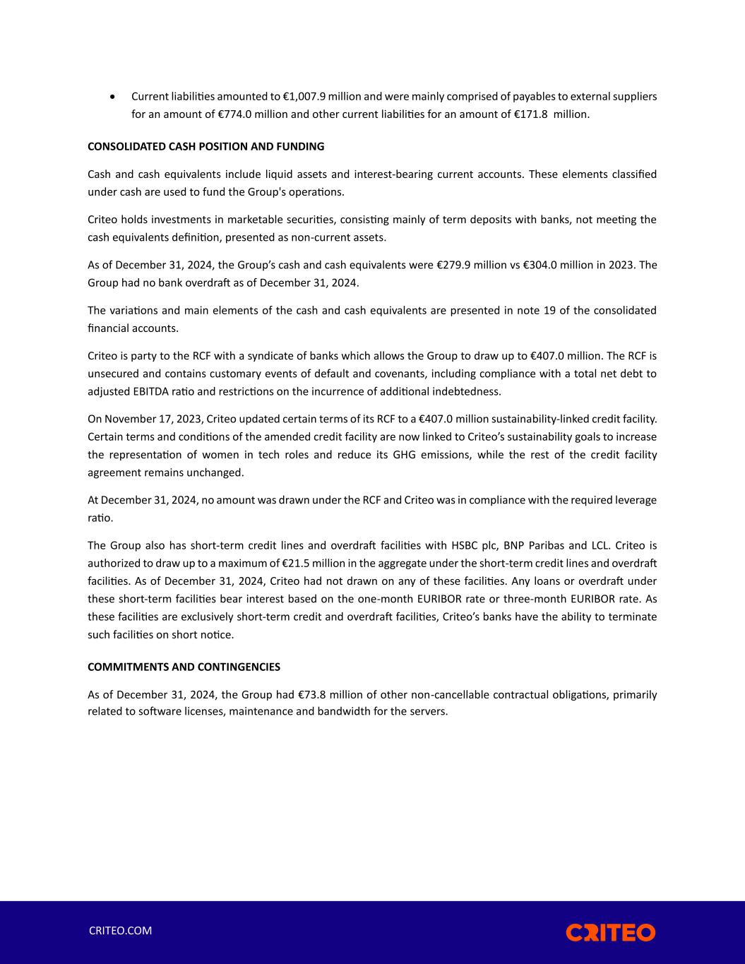 CRITEO.COM • Current liabilities amounted to €1,007.9 million and were mainly comprised of payables to external suppliers for an amount of €774.0 million and other current liabilities for an amount of €171.8 million. CONSOLIDATED CASH POSITION AND FUNDING Cash and cash equivalents include liquid assets and interest-bearing current accounts. These elements classified under cash are used to fund the Group's operations. Criteo holds investments in marketable securities, consisting mainly of term deposits with banks, not meeting the cash equivalents definition, presented as non-current assets. As of December 31, 2024, the Group’s cash and cash equivalents were €279.9 million vs €304.0 million in 2023. The Group had no bank overdraft as of December 31, 2024. The variations and main elements of the cash and cash equivalents are presented in note 19 of the consolidated financial accounts. Criteo is party to the RCF with a syndicate of banks which allows the Group to draw up to €407.0 million. The RCF is unsecured and contains customary events of default and covenants, including compliance with a total net debt to adjusted EBITDA ratio and restrictions on the incurrence of additional indebtedness. On November 17, 2023, Criteo updated certain terms of its RCF to a €407.0 million sustainability-linked credit facility. Certain terms and conditions of the amended credit facility are now linked to Criteo’s sustainability goals to increase the representation of women in tech roles and reduce its GHG emissions, while the rest of the credit facility agreement remains unchanged. At December 31, 2024, no amount was drawn under the RCF and Criteo was in compliance with the required leverage ratio. The Group also has short-term credit lines and overdraft facilities with HSBC plc, BNP Paribas and LCL. Criteo is authorized to draw up to a maximum of €21.5 million in the aggregate under the short-term credit lines and overdraft facilities. As of December 31, 2024, Criteo had not drawn on any of these facilities. Any loans or overdraft under these short-term facilities bear interest based on the one-month EURIBOR rate or three-month EURIBOR rate. As these facilities are exclusively short-term credit and overdraft facilities, Criteo’s banks have the ability to terminate such facilities on short notice. COMMITMENTS AND CONTINGENCIES As of December 31, 2024, the Group had €73.8 million of other non-cancellable contractual obligations, primarily related to software licenses, maintenance and bandwidth for the servers.