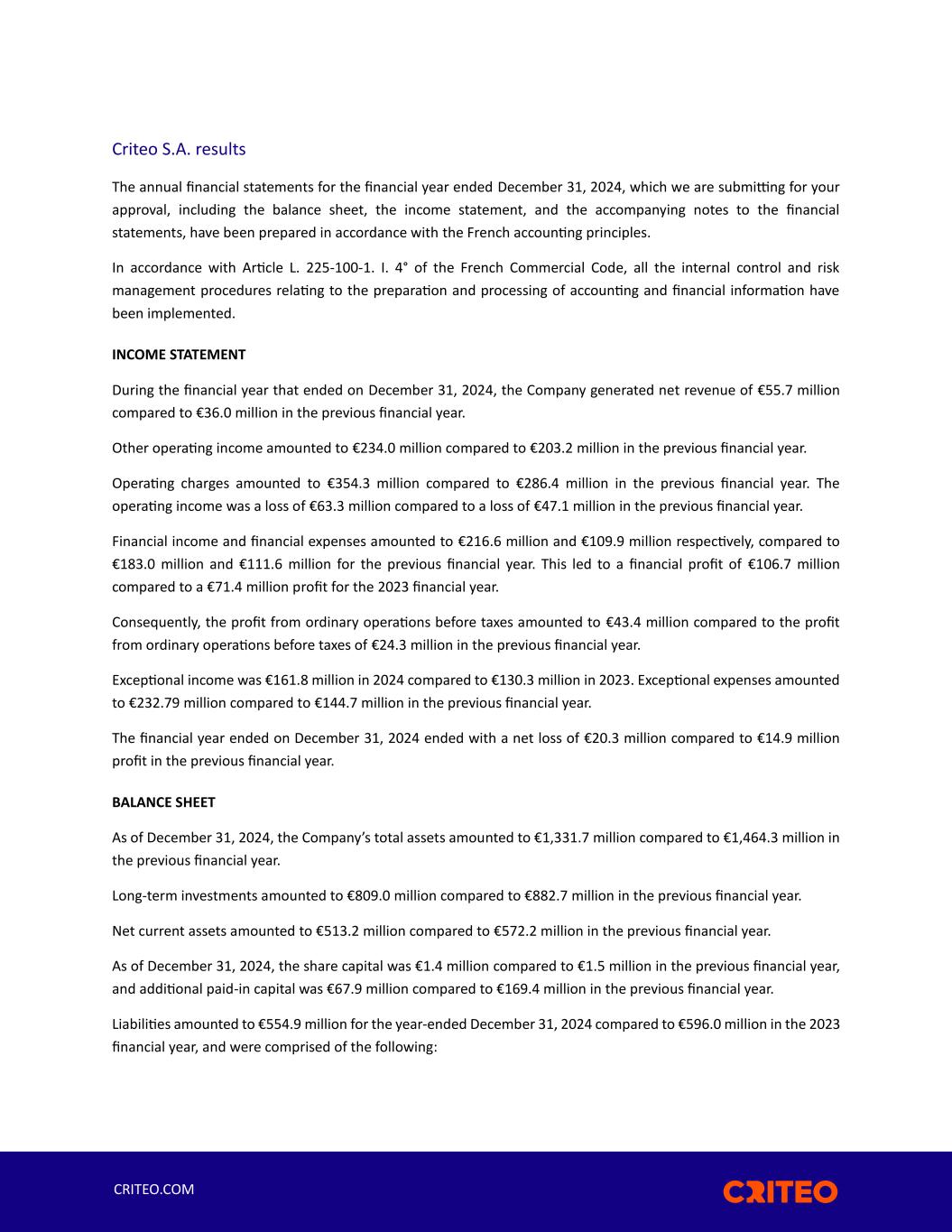 CRITEO.COM Criteo S.A. results The annual financial statements for the financial year ended December 31, 2024, which we are submitting for your approval, including the balance sheet, the income statement, and the accompanying notes to the financial statements, have been prepared in accordance with the French accounting principles. In accordance with Article L. 225-100-1. I. 4° of the French Commercial Code, all the internal control and risk management procedures relating to the preparation and processing of accounting and financial information have been implemented. INCOME STATEMENT During the financial year that ended on December 31, 2024, the Company generated net revenue of €55.7 million compared to €36.0 million in the previous financial year. Other operating income amounted to €234.0 million compared to €203.2 million in the previous financial year. Operating charges amounted to €354.3 million compared to €286.4 million in the previous financial year. The operating income was a loss of €63.3 million compared to a loss of €47.1 million in the previous financial year. Financial income and financial expenses amounted to €216.6 million and €109.9 million respectively, compared to €183.0 million and €111.6 million for the previous financial year. This led to a financial profit of €106.7 million compared to a €71.4 million profit for the 2023 financial year. Consequently, the profit from ordinary operations before taxes amounted to €43.4 million compared to the profit from ordinary operations before taxes of €24.3 million in the previous financial year. Exceptional income was €161.8 million in 2024 compared to €130.3 million in 2023. Exceptional expenses amounted to €232.79 million compared to €144.7 million in the previous financial year. The financial year ended on December 31, 2024 ended with a net loss of €20.3 million compared to €14.9 million profit in the previous financial year. BALANCE SHEET As of December 31, 2024, the Company’s total assets amounted to €1,331.7 million compared to €1,464.3 million in the previous financial year. Long-term investments amounted to €809.0 million compared to €882.7 million in the previous financial year. Net current assets amounted to €513.2 million compared to €572.2 million in the previous financial year. As of December 31, 2024, the share capital was €1.4 million compared to €1.5 million in the previous financial year, and additional paid-in capital was €67.9 million compared to €169.4 million in the previous financial year. Liabilities amounted to €554.9 million for the year-ended December 31, 2024 compared to €596.0 million in the 2023 financial year, and were comprised of the following: