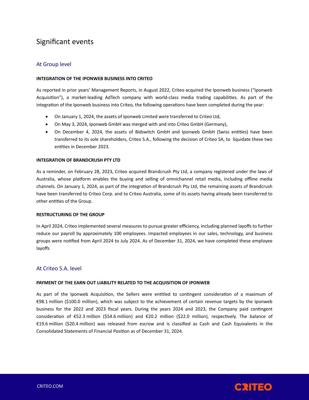 CRITEO.COM Significant events At Group level INTEGRATION OF THE IPONWEB BUSINESS INTO CRITEO As reported in prior years’ Management Reports, in August 2022, Criteo acquired the Iponweb business (“Iponweb Acquisition”), a market-leading AdTech company with world-class media trading capabilities. As part of the integration of the Iponweb business into Criteo, the following operations have been completed during the year: • On January 1, 2024, the assets of Iponweb Limited were transferred to Criteo Ltd, • On May 3, 2024, Iponweb GmbH was merged with and into Criteo GmbH (Germany), • On December 4, 2024, the assets of Bidswitch GmbH and Iponweb GmbH (Swiss entities) have been transferred to its sole shareholders, Criteo S.A., following the decision of Criteo SA, to liquidate these two entities in December 2023. INTEGRATION OF BRANDCRUSH PTY LTD As a reminder, on February 28, 2023, Criteo acquired Brandcrush Pty Ltd, a company registered under the laws of Australia, whose platform enables the buying and selling of omnichannel retail media, including offline media channels. On January 1, 2024, as part of the integration of Brandcrush Pty Ltd, the remaining assets of Brandcrush have been transferred to Criteo Corp. and to Criteo Australia, some of its assets having already been transferred to other entities of the Group. RESTRUCTURING OF THE GROUP In April 2024, Criteo implemented several measures to pursue greater efficiency, including planned layoffs to further reduce our payroll by approximately 100 employees. Impacted employees in our sales, technology, and business groups were notified from April 2024 to July 2024. As of December 31, 2024, we have completed these employee layoffs At Criteo S.A. level PAYMENT OF THE EARN OUT LIABILITY RELATED TO THE ACQUISITION OF IPONWEB As part of the Iponweb Acquisition, the Sellers were entitled to contingent consideration of a maximum of €98.1 million ($100.0 million), which was subject to the achievement of certain revenue targets by the Iponweb business for the 2022 and 2023 fiscal years. During the years 2024 and 2023, the Company paid contingent consideration of €52.3 million ($54.6 million) and €20.2 million ($22.0 million), respectively. The balance of €19.6 million ($20.4 million) was released from escrow and is classified as Cash and Cash Equivalents in the Consolidated Statements of Financial Position as of December 31, 2024.