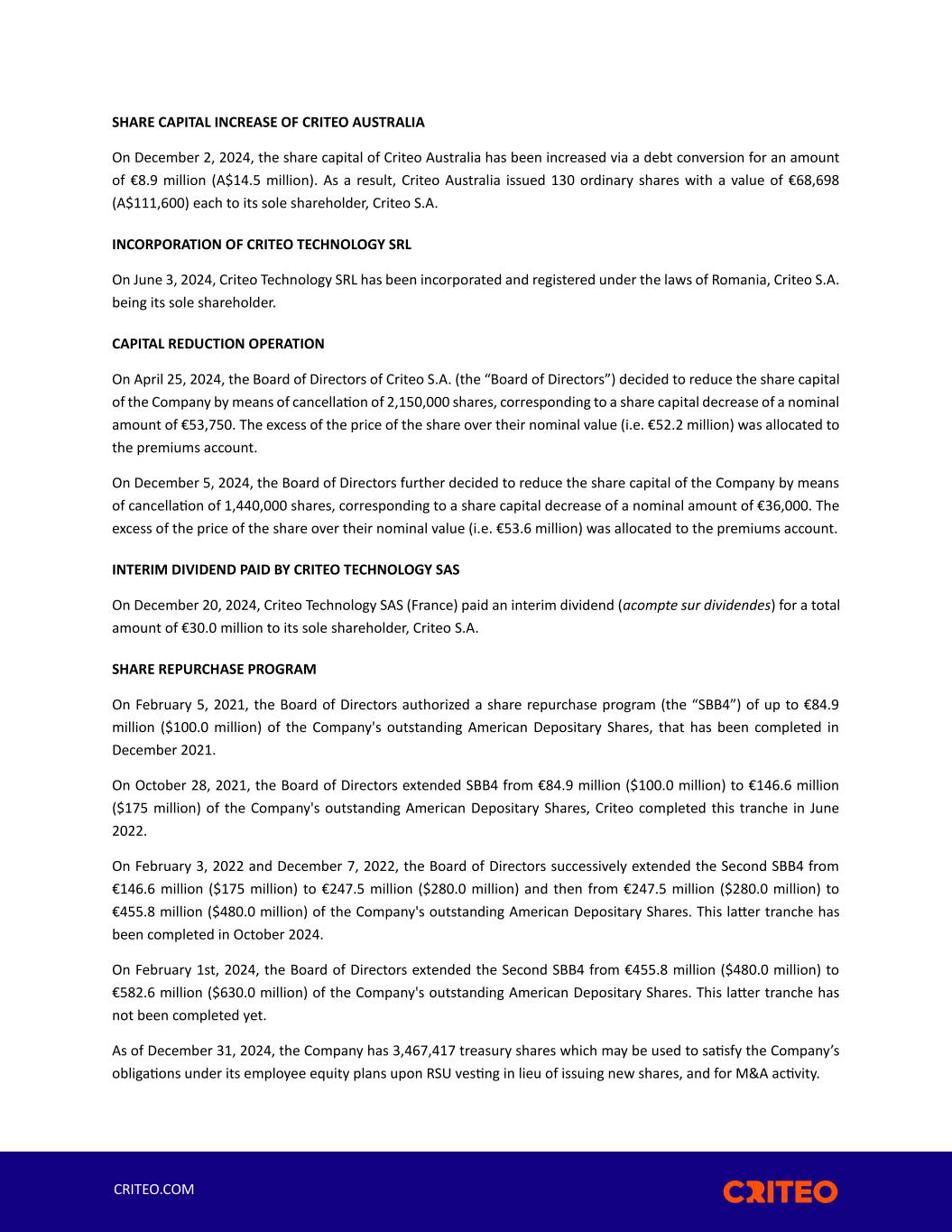 CRITEO.COM SHARE CAPITAL INCREASE OF CRITEO AUSTRALIA On December 2, 2024, the share capital of Criteo Australia has been increased via a debt conversion for an amount of €8.9 million (A$14.5 million). As a result, Criteo Australia issued 130 ordinary shares with a value of €68,698 (A$111,600) each to its sole shareholder, Criteo S.A. INCORPORATION OF CRITEO TECHNOLOGY SRL On June 3, 2024, Criteo Technology SRL has been incorporated and registered under the laws of Romania, Criteo S.A. being its sole shareholder. CAPITAL REDUCTION OPERATION On April 25, 2024, the Board of Directors of Criteo S.A. (the “Board of Directors”) decided to reduce the share capital of the Company by means of cancellation of 2,150,000 shares, corresponding to a share capital decrease of a nominal amount of €53,750. The excess of the price of the share over their nominal value (i.e. €52.2 million) was allocated to the premiums account. On December 5, 2024, the Board of Directors further decided to reduce the share capital of the Company by means of cancellation of 1,440,000 shares, corresponding to a share capital decrease of a nominal amount of €36,000. The excess of the price of the share over their nominal value (i.e. €53.6 million) was allocated to the premiums account. INTERIM DIVIDEND PAID BY CRITEO TECHNOLOGY SAS On December 20, 2024, Criteo Technology SAS (France) paid an interim dividend (acompte sur dividendes) for a total amount of €30.0 million to its sole shareholder, Criteo S.A. SHARE REPURCHASE PROGRAM On February 5, 2021, the Board of Directors authorized a share repurchase program (the “SBB4”) of up to €84.9 million ($100.0 million) of the Company's outstanding American Depositary Shares, that has been completed in December 2021. On October 28, 2021, the Board of Directors extended SBB4 from €84.9 million ($100.0 million) to €146.6 million ($175 million) of the Company's outstanding American Depositary Shares, Criteo completed this tranche in June 2022. On February 3, 2022 and December 7, 2022, the Board of Directors successively extended the Second SBB4 from €146.6 million ($175 million) to €247.5 million ($280.0 million) and then from €247.5 million ($280.0 million) to €455.8 million ($480.0 million) of the Company's outstanding American Depositary Shares. This latter tranche has been completed in October 2024. On February 1st, 2024, the Board of Directors extended the Second SBB4 from €455.8 million ($480.0 million) to €582.6 million ($630.0 million) of the Company's outstanding American Depositary Shares. This latter tranche has not been completed yet. As of December 31, 2024, the Company has 3,467,417 treasury shares which may be used to satisfy the Company’s obligations under its employee equity plans upon RSU vesting in lieu of issuing new shares, and for M&A activity.