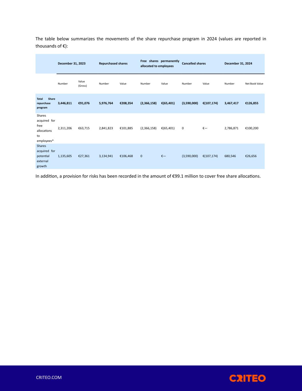 CRITEO.COM The table below summarizes the movements of the share repurchase program in 2024 (values are reported in thousands of €): December 31, 2023 Repurchased shares Free shares permanently allocated to employees Cancelled shares December 31, 2024 Number Value (Gross) Number Value Number Value Number Value Number Net Book Value Total Share repurchase program 3,446,811 €91,076 5,976,764 €208,354 (2,366,158) €(65,401) (3,590,000) €(107,174) 3,467,417 €126,855 Shares acquired for free allocations to employees* 2,311,206 €63,715 2,841,823 €101,885 (2,366,158) €(65,401) 0 €— 2,786,871 €100,200 Shares acquired for potential external growth 1,135,605 €27,361 3,134,941 €106,468 0 €— (3,590,000) €(107,174) 680,546 €26,656 In addition, a provision for risks has been recorded in the amount of €99.1 million to cover free share allocations.