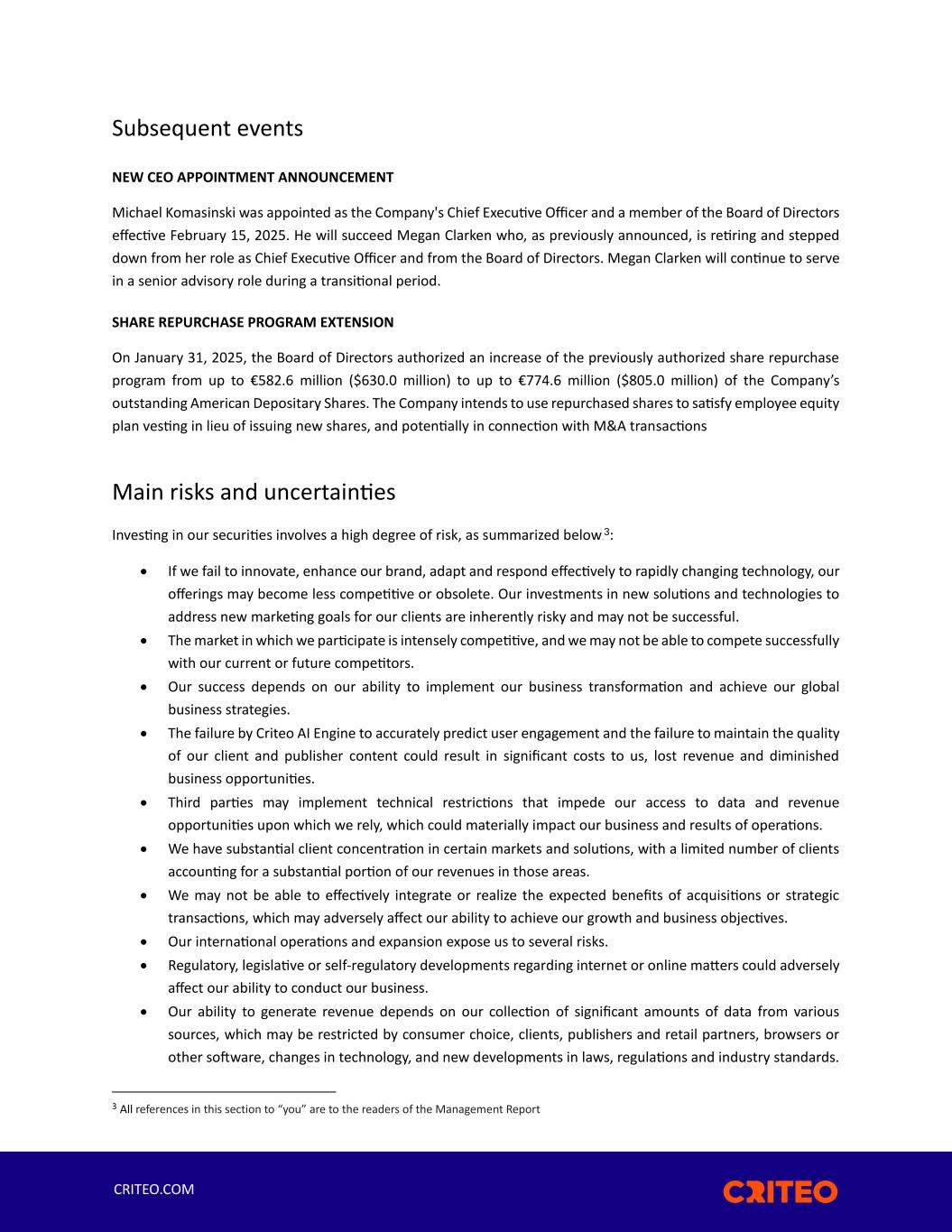 CRITEO.COM Subsequent events NEW CEO APPOINTMENT ANNOUNCEMENT Michael Komasinski was appointed as the Company's Chief Executive Officer and a member of the Board of Directors effective February 15, 2025. He will succeed Megan Clarken who, as previously announced, is retiring and stepped down from her role as Chief Executive Officer and from the Board of Directors. Megan Clarken will continue to serve in a senior advisory role during a transitional period. SHARE REPURCHASE PROGRAM EXTENSION On January 31, 2025, the Board of Directors authorized an increase of the previously authorized share repurchase program from up to €582.6 million ($630.0 million) to up to €774.6 million ($805.0 million) of the Company’s outstanding American Depositary Shares. The Company intends to use repurchased shares to satisfy employee equity plan vesting in lieu of issuing new shares, and potentially in connection with M&A transactions Main risks and uncertainties Investing in our securities involves a high degree of risk, as summarized below 2F 3: • If we fail to innovate, enhance our brand, adapt and respond effectively to rapidly changing technology, our offerings may become less competitive or obsolete. Our investments in new solutions and technologies to address new marketing goals for our clients are inherently risky and may not be successful. • The market in which we participate is intensely competitive, and we may not be able to compete successfully with our current or future competitors. • Our success depends on our ability to implement our business transformation and achieve our global business strategies. • The failure by Criteo AI Engine to accurately predict user engagement and the failure to maintain the quality of our client and publisher content could result in significant costs to us, lost revenue and diminished business opportunities. • Third parties may implement technical restrictions that impede our access to data and revenue opportunities upon which we rely, which could materially impact our business and results of operations. • We have substantial client concentration in certain markets and solutions, with a limited number of clients accounting for a substantial portion of our revenues in those areas. • We may not be able to effectively integrate or realize the expected benefits of acquisitions or strategic transactions, which may adversely affect our ability to achieve our growth and business objectives. • Our international operations and expansion expose us to several risks. • Regulatory, legislative or self-regulatory developments regarding internet or online matters could adversely affect our ability to conduct our business. • Our ability to generate revenue depends on our collection of significant amounts of data from various sources, which may be restricted by consumer choice, clients, publishers and retail partners, browsers or other software, changes in technology, and new developments in laws, regulations and industry standards. 3 All references in this section to “you” are to the readers of the Management Report