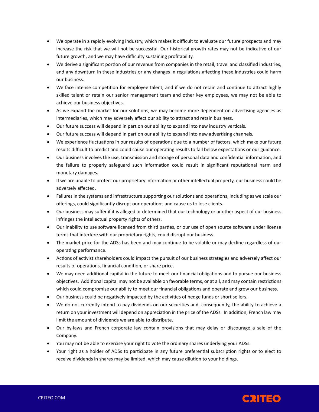 CRITEO.COM • We operate in a rapidly evolving industry, which makes it difficult to evaluate our future prospects and may increase the risk that we will not be successful. Our historical growth rates may not be indicative of our future growth, and we may have difficulty sustaining profitability. • We derive a significant portion of our revenue from companies in the retail, travel and classified industries, and any downturn in these industries or any changes in regulations affecting these industries could harm our business. • We face intense competition for employee talent, and if we do not retain and continue to attract highly skilled talent or retain our senior management team and other key employees, we may not be able to achieve our business objectives. • As we expand the market for our solutions, we may become more dependent on advertising agencies as intermediaries, which may adversely affect our ability to attract and retain business. • Our future success will depend in part on our ability to expand into new industry verticals. • Our future success will depend in part on our ability to expand into new advertising channels. • We experience fluctuations in our results of operations due to a number of factors, which make our future results difficult to predict and could cause our operating results to fall below expectations or our guidance. • Our business involves the use, transmission and storage of personal data and confidential information, and the failure to properly safeguard such information could result in significant reputational harm and monetary damages. • If we are unable to protect our proprietary information or other intellectual property, our business could be adversely affected. • Failures in the systems and infrastructure supporting our solutions and operations, including as we scale our offerings, could significantly disrupt our operations and cause us to lose clients. • Our business may suffer if it is alleged or determined that our technology or another aspect of our business infringes the intellectual property rights of others. • Our inability to use software licensed from third parties, or our use of open source software under license terms that interfere with our proprietary rights, could disrupt our business. • The market price for the ADSs has been and may continue to be volatile or may decline regardless of our operating performance. • Actions of activist shareholders could impact the pursuit of our business strategies and adversely affect our results of operations, financial condition, or share price. • We may need additional capital in the future to meet our financial obligations and to pursue our business objectives. Additional capital may not be available on favorable terms, or at all, and may contain restrictions which could compromise our ability to meet our financial obligations and operate and grow our business. • Our business could be negatively impacted by the activities of hedge funds or short sellers. • We do not currently intend to pay dividends on our securities and, consequently, the ability to achieve a return on your investment will depend on appreciation in the price of the ADSs. In addition, French law may limit the amount of dividends we are able to distribute. • Our by-laws and French corporate law contain provisions that may delay or discourage a sale of the Company. • You may not be able to exercise your right to vote the ordinary shares underlying your ADSs. • Your right as a holder of ADSs to participate in any future preferential subscription rights or to elect to receive dividends in shares may be limited, which may cause dilution to your holdings.