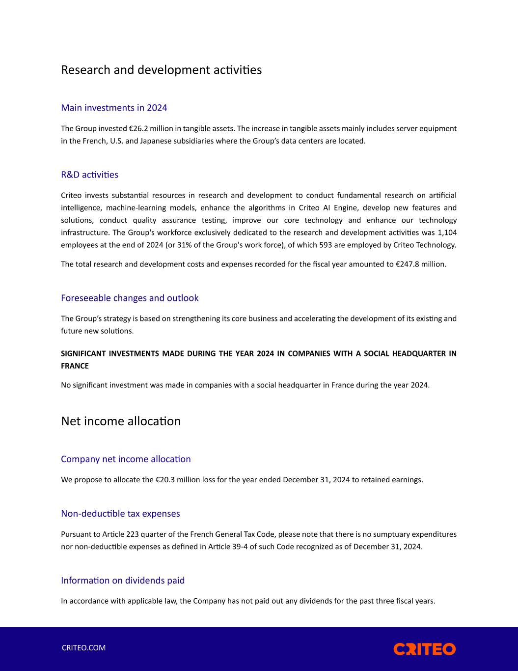CRITEO.COM Research and development activities Main investments in 2024 The Group invested €26.2 million in tangible assets. The increase in tangible assets mainly includes server equipment in the French, U.S. and Japanese subsidiaries where the Group’s data centers are located. R&D activities Criteo invests substantial resources in research and development to conduct fundamental research on artificial intelligence, machine-learning models, enhance the algorithms in Criteo AI Engine, develop new features and solutions, conduct quality assurance testing, improve our core technology and enhance our technology infrastructure. The Group's workforce exclusively dedicated to the research and development activities was 1,104 employees at the end of 2024 (or 31% of the Group's work force), of which 593 are employed by Criteo Technology. The total research and development costs and expenses recorded for the fiscal year amounted to €247.8 million. Foreseeable changes and outlook The Group’s strategy is based on strengthening its core business and accelerating the development of its existing and future new solutions. SIGNIFICANT INVESTMENTS MADE DURING THE YEAR 2024 IN COMPANIES WITH A SOCIAL HEADQUARTER IN FRANCE No significant investment was made in companies with a social headquarter in France during the year 2024. Net income allocation Company net income allocation We propose to allocate the €20.3 million loss for the year ended December 31, 2024 to retained earnings. Non-deductible tax expenses Pursuant to Article 223 quarter of the French General Tax Code, please note that there is no sumptuary expenditures nor non-deductible expenses as defined in Article 39-4 of such Code recognized as of December 31, 2024. Information on dividends paid In accordance with applicable law, the Company has not paid out any dividends for the past three fiscal years.