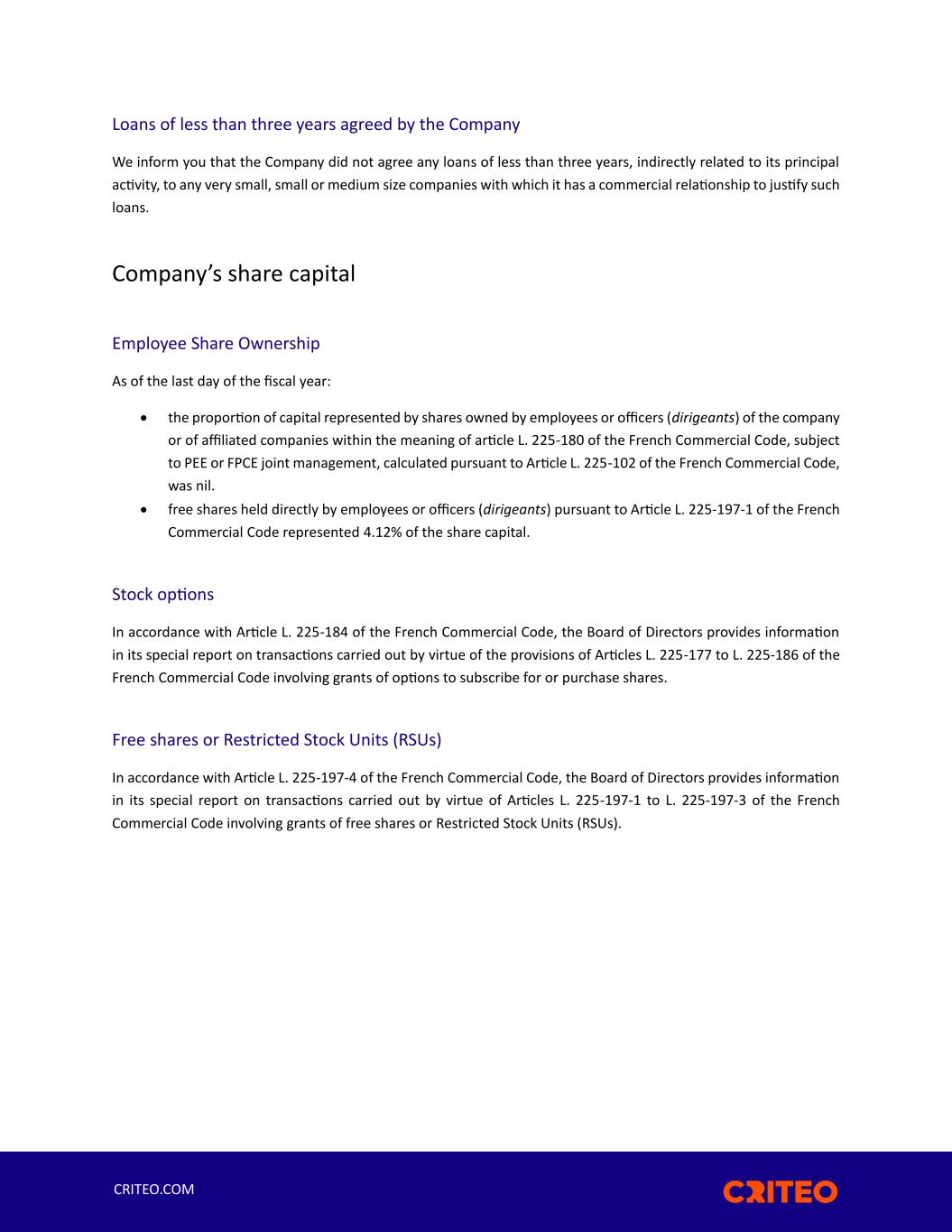 CRITEO.COM Loans of less than three years agreed by the Company We inform you that the Company did not agree any loans of less than three years, indirectly related to its principal activity, to any very small, small or medium size companies with which it has a commercial relationship to justify such loans. Company’s share capital Employee Share Ownership As of the last day of the fiscal year: • the proportion of capital represented by shares owned by employees or officers (dirigeants) of the company or of affiliated companies within the meaning of article L. 225-180 of the French Commercial Code, subject to PEE or FPCE joint management, calculated pursuant to Article L. 225-102 of the French Commercial Code, was nil. • free shares held directly by employees or officers (dirigeants) pursuant to Article L. 225-197-1 of the French Commercial Code represented 4.12% of the share capital. Stock options In accordance with Article L. 225-184 of the French Commercial Code, the Board of Directors provides information in its special report on transactions carried out by virtue of the provisions of Articles L. 225-177 to L. 225-186 of the French Commercial Code involving grants of options to subscribe for or purchase shares. Free shares or Restricted Stock Units (RSUs) In accordance with Article L. 225-197-4 of the French Commercial Code, the Board of Directors provides information in its special report on transactions carried out by virtue of Articles L. 225-197-1 to L. 225-197-3 of the French Commercial Code involving grants of free shares or Restricted Stock Units (RSUs).