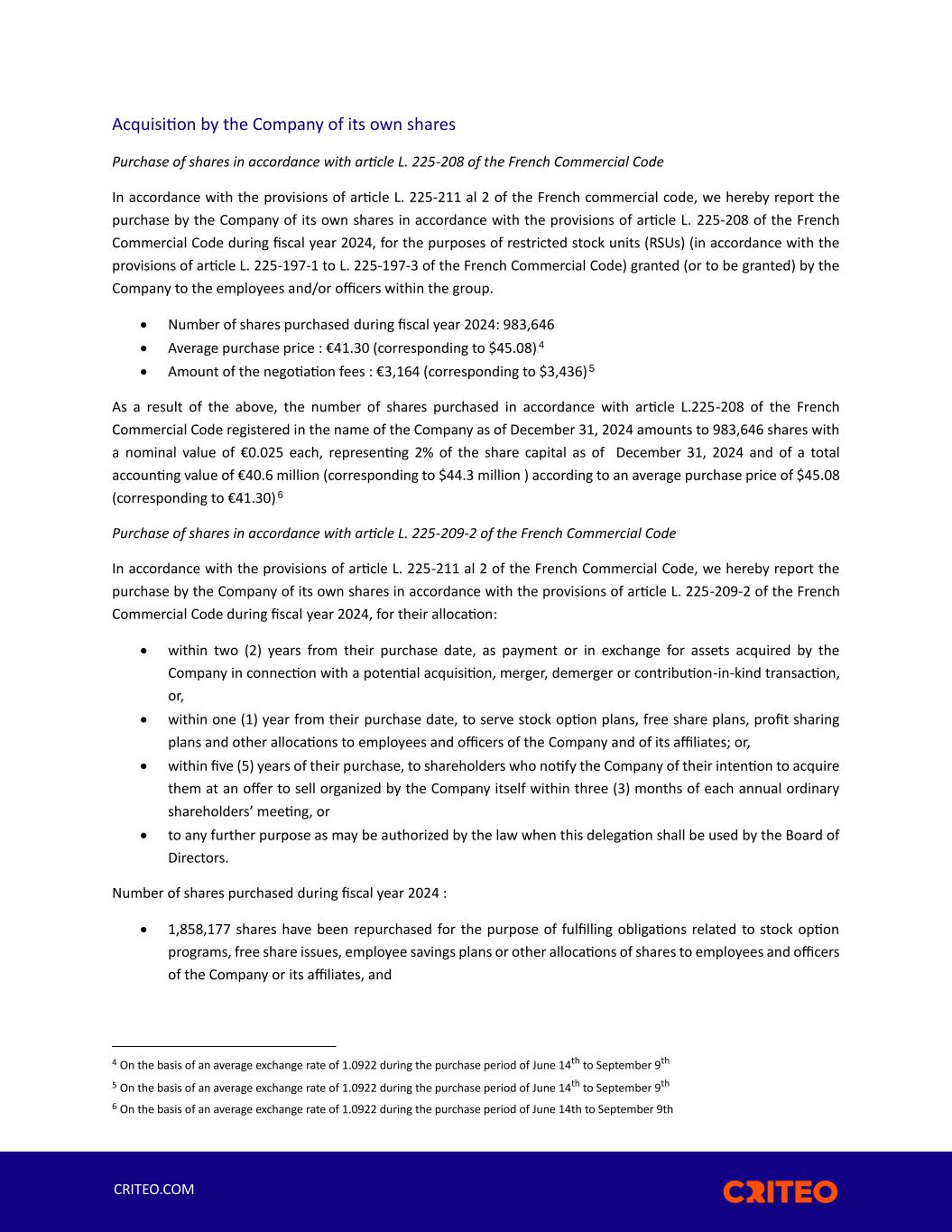 CRITEO.COM Acquisition by the Company of its own shares Purchase of shares in accordance with article L. 225-208 of the French Commercial Code In accordance with the provisions of article L. 225-211 al 2 of the French commercial code, we hereby report the purchase by the Company of its own shares in accordance with the provisions of article L. 225-208 of the French Commercial Code during fiscal year 2024, for the purposes of restricted stock units (RSUs) (in accordance with the provisions of article L. 225-197-1 to L. 225-197-3 of the French Commercial Code) granted (or to be granted) by the Company to the employees and/or officers within the group. • Number of shares purchased during fiscal year 2024: 983,646 • Average purchase price : €41.30 (corresponding to $45.08)3F 4 • Amount of the negotiation fees : €3,164 (corresponding to $3,436)4F 5 As a result of the above, the number of shares purchased in accordance with article L.225-208 of the French Commercial Code registered in the name of the Company as of December 31, 2024 amounts to 983,646 shares with a nominal value of €0.025 each, representing 2% of the share capital as of December 31, 2024 and of a total accounting value of €40.6 million (corresponding to $44.3 million ) according to an average purchase price of $45.08 (corresponding to €41.30)5F 6 Purchase of shares in accordance with article L. 225-209-2 of the French Commercial Code In accordance with the provisions of article L. 225-211 al 2 of the French Commercial Code, we hereby report the purchase by the Company of its own shares in accordance with the provisions of article L. 225-209-2 of the French Commercial Code during fiscal year 2024, for their allocation: • within two (2) years from their purchase date, as payment or in exchange for assets acquired by the Company in connection with a potential acquisition, merger, demerger or contribution-in-kind transaction, or, • within one (1) year from their purchase date, to serve stock option plans, free share plans, profit sharing plans and other allocations to employees and officers of the Company and of its affiliates; or, • within five (5) years of their purchase, to shareholders who notify the Company of their intention to acquire them at an offer to sell organized by the Company itself within three (3) months of each annual ordinary shareholders’ meeting, or • to any further purpose as may be authorized by the law when this delegation shall be used by the Board of Directors. Number of shares purchased during fiscal year 2024 : • 1,858,177 shares have been repurchased for the purpose of fulfilling obligations related to stock option programs, free share issues, employee savings plans or other allocations of shares to employees and officers of the Company or its affiliates, and 4 On the basis of an average exchange rate of 1.0922 during the purchase period of June 14th to September 9th 5 On the basis of an average exchange rate of 1.0922 during the purchase period of June 14th to September 9th 6 On the basis of an average exchange rate of 1.0922 during the purchase period of June 14th to September 9th