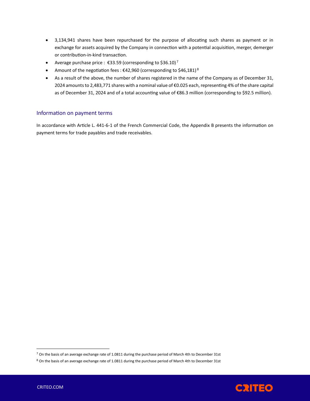 CRITEO.COM • 3,134,941 shares have been repurchased for the purpose of allocating such shares as payment or in exchange for assets acquired by the Company in connection with a potential acquisition, merger, demerger or contribution-in-kind transaction. • Average purchase price : €33.59 (corresponding to $36.10) 6F 7 • Amount of the negotiation fees : €42,960 (corresponding to $46,181) 7F 8 • As a result of the above, the number of shares registered in the name of the Company as of December 31, 2024 amounts to 2,483,771 shares with a nominal value of €0.025 each, representing 4% of the share capital as of December 31, 2024 and of a total accounting value of €86.3 million (corresponding to $92.5 million). Information on payment terms In accordance with Article L. 441-6-1 of the French Commercial Code, the Appendix B presents the information on payment terms for trade payables and trade receivables. 7 On the basis of an average exchange rate of 1.0811 during the purchase period of March 4th to December 31st 8 On the basis of an average exchange rate of 1.0811 during the purchase period of March 4th to December 31st
