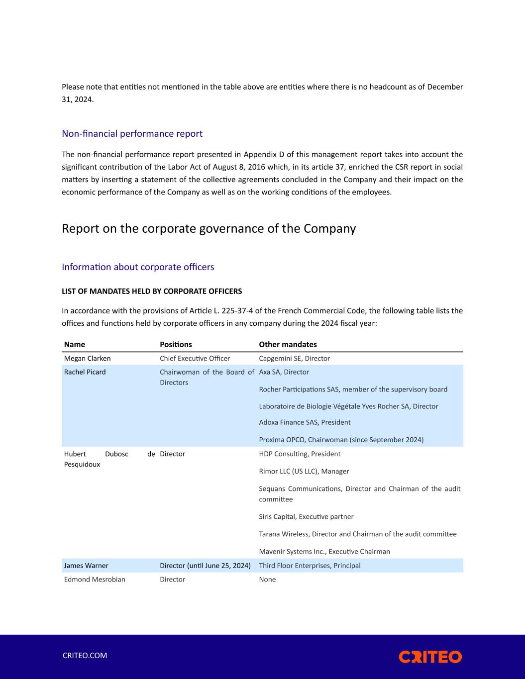 CRITEO.COM Please note that entities not mentioned in the table above are entities where there is no headcount as of December 31, 2024. Non-financial performance report The non-financial performance report presented in Appendix D of this management report takes into account the significant contribution of the Labor Act of August 8, 2016 which, in its article 37, enriched the CSR report in social matters by inserting a statement of the collective agreements concluded in the Company and their impact on the economic performance of the Company as well as on the working conditions of the employees. Report on the corporate governance of the Company Information about corporate officers LIST OF MANDATES HELD BY CORPORATE OFFICERS In accordance with the provisions of Article L. 225-37-4 of the French Commercial Code, the following table lists the offices and functions held by corporate officers in any company during the 2024 fiscal year: Name Positions Other mandates Megan Clarken Chief Executive Officer Capgemini SE, Director Rachel Picard Chairwoman of the Board of Directors Axa SA, Director Rocher Participations SAS, member of the supervisory board Laboratoire de Biologie Végétale Yves Rocher SA, Director Adoxa Finance SAS, President Proxima OPCO, Chairwoman (since September 2024) Hubert Dubosc de Pesquidoux Director HDP Consulting, President Rimor LLC (US LLC), Manager Sequans Communications, Director and Chairman of the audit committee Siris Capital, Executive partner Tarana Wireless, Director and Chairman of the audit committee Mavenir Systems Inc., Executive Chairman James Warner Director (until June 25, 2024) Third Floor Enterprises, Principal Edmond Mesrobian Director None
