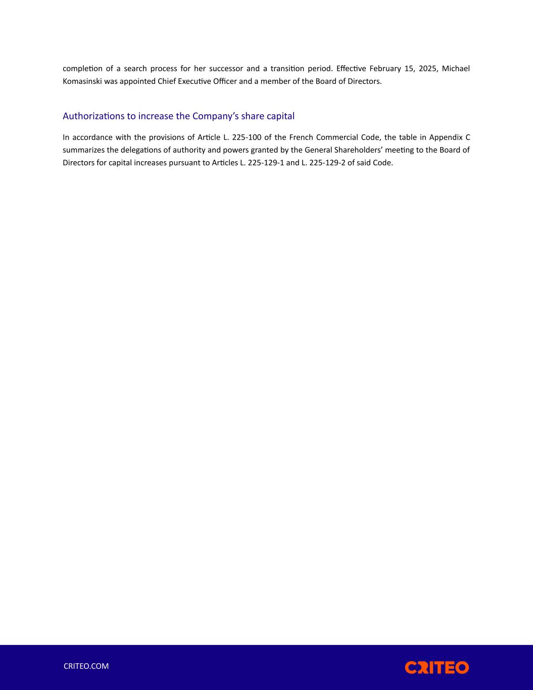 CRITEO.COM completion of a search process for her successor and a transition period. Effective February 15, 2025, Michael Komasinski was appointed Chief Executive Officer and a member of the Board of Directors. Authorizations to increase the Company’s share capital In accordance with the provisions of Article L. 225-100 of the French Commercial Code, the table in Appendix C summarizes the delegations of authority and powers granted by the General Shareholders’ meeting to the Board of Directors for capital increases pursuant to Articles L. 225-129-1 and L. 225-129-2 of said Code.