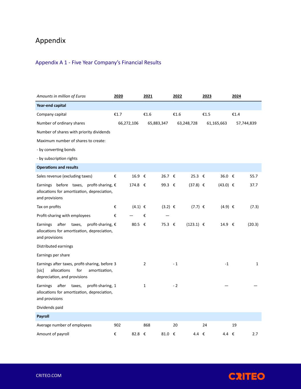 CRITEO.COM Appendix Appendix A 1 - Five Year Company’s Financial Results Amounts in million of Euros 2020 2021 2022 2023 2024 Year-end capital Company capital €1.7 €1.6 €1.6 €1.5 €1.4 Number of ordinary shares 66,272,106 65,883,347 63,248,728 61,165,663 57,744,839 Number of shares with priority dividends Maximum number of shares to create: - by converting bonds - by subscription rights Operations and results Sales revenue (excluding taxes) € 16.9 € 26.7 € 25.3 € 36.0 € 55.7 Earnings before taxes, profit-sharing, allocations for amortization, depreciation, and provisions € 174.8 € 99.3 € (37.8) € (43.0) € 37.7 Tax on profits € (4.1) € (3.2) € (7.7) € (4.9) € (7.3) Profit-sharing with employees € — € — Earnings after taxes, profit-sharing, allocations for amortization, depreciation, and provisions € 80.5 € 75.3 € (123.1) € 14.9 € (20.3) Distributed earnings Earnings per share Earnings after taxes, profit-sharing, before [sic] allocations for amortization, depreciation, and provisions 3 2 - 1 -1 1 Earnings after taxes, profit-sharing, allocations for amortization, depreciation, and provisions 1 1 - 2 — — Dividends paid Payroll Average number of employees 902 868 20 24 19 Amount of payroll € 82.8 € 81.0 € 4.4 € 4.4 € 2.7