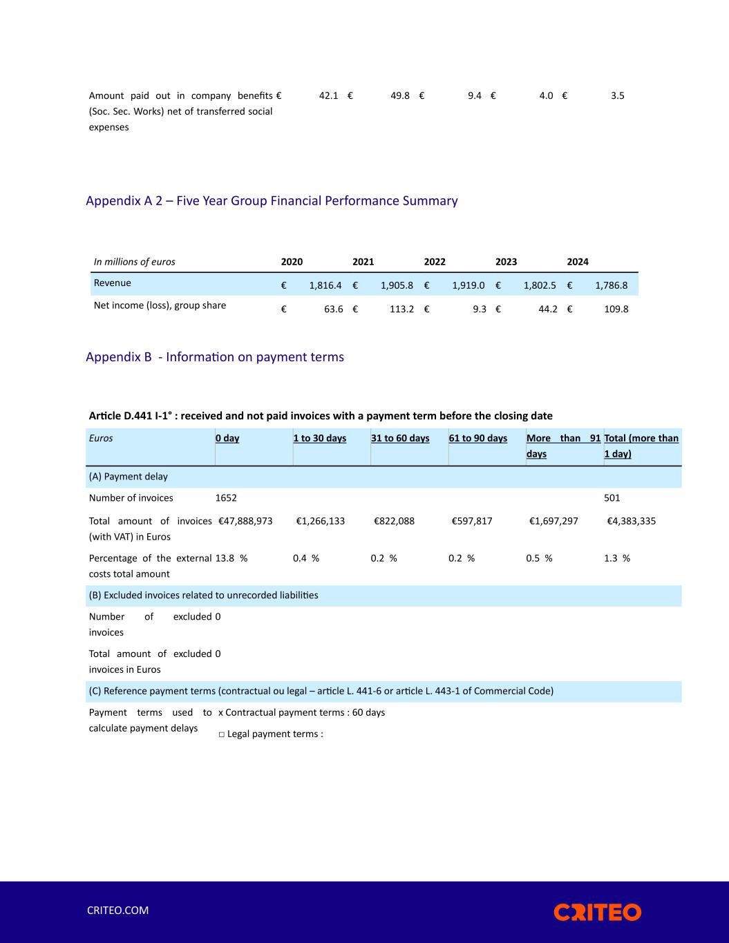 CRITEO.COM Appendix A 2 – Five Year Group Financial Performance Summary In millions of euros 2020 2021 2022 2023 2024 Revenue € 1,816.4 € 1,905.8 € 1,919.0 € 1,802.5 € 1,786.8 Net income (loss), group share € 63.6 € 113.2 € 9.3 € 44.2 € 109.8 Appendix B - Information on payment terms Article D.441 I-1° : received and not paid invoices with a payment term before the closing date Euros 0 day 1 to 30 days 31 to 60 days 61 to 90 days More than 91 days Total (more than 1 day) (A) Payment delay Number of invoices 1652 501 Total amount of invoices (with VAT) in Euros €47,888,973 €1,266,133 €822,088 €597,817 €1,697,297 €4,383,335 Percentage of the external costs total amount 13.8 % 0.4 % 0.2 % 0.2 % 0.5 % 1.3 % (B) Excluded invoices related to unrecorded liabilities Number of excluded invoices 0 Total amount of excluded invoices in Euros 0 (C) Reference payment terms (contractual ou legal – article L. 441-6 or article L. 443-1 of Commercial Code) Payment terms used to calculate payment delays x Contractual payment terms : 60 days □ Legal payment terms : Amount paid out in company benefits (Soc. Sec. Works) net of transferred social expenses € 42.1 € 49.8 € 9.4 € 4.0 € 3.5