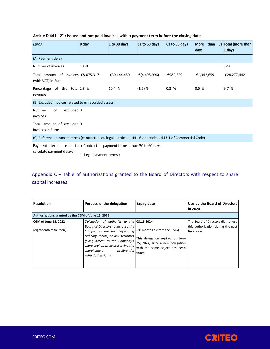 CRITEO.COM Article D.441 I-2° : issued and not paid invoices with a payment term before the closing date Euros 0 day 1 to 30 days 31 to 60 days 61 to 90 days More than 91 days Total (more than 1 day) (A) Payment delay Number of invoices 1050 973 Total amount of invoices (with VAT) in Euros €8,075,317 €30,444,450 €(4,498,996) €989,329 €1,342,659 €28,277,442 Percentage of the total revenue 2.8 % 10.4 % (1.5) % 0.3 % 0.5 % 9.7 % (B) Excluded invoices related to unrecorded assets Number of excluded invoices 0 Total amount of excluded invoices in Euros 0 (C) Reference payment terms (contractual ou legal – article L. 441-6 or article L. 443-1 of Commercial Code) Payment terms used to calculate payment delays x Contractual payment terms : from 30 to 60 days □ Legal payment terms : Appendix C – Table of authorizations granted to the Board of Directors with respect to share capital increases Resolution Purpose of the delegation Expiry date Use by the Board of Directors in 2024 Authorizations granted by the CGM of June 15, 2022 CGM of June 15, 2022 (eighteenth resolution) Delegation of authority to the Board of Directors to increase the Company’s share capital by issuing ordinary shares, or any securities giving access to the Company’s share capital, while preserving the shareholders’ preferential subscription rights. 08.15.2024 (26 months as from the CMG) This delegation expired on June 25, 2024, since a new delegation with the same object has been voted. The Board of Directors did not use this authorization during the past fiscal year.
