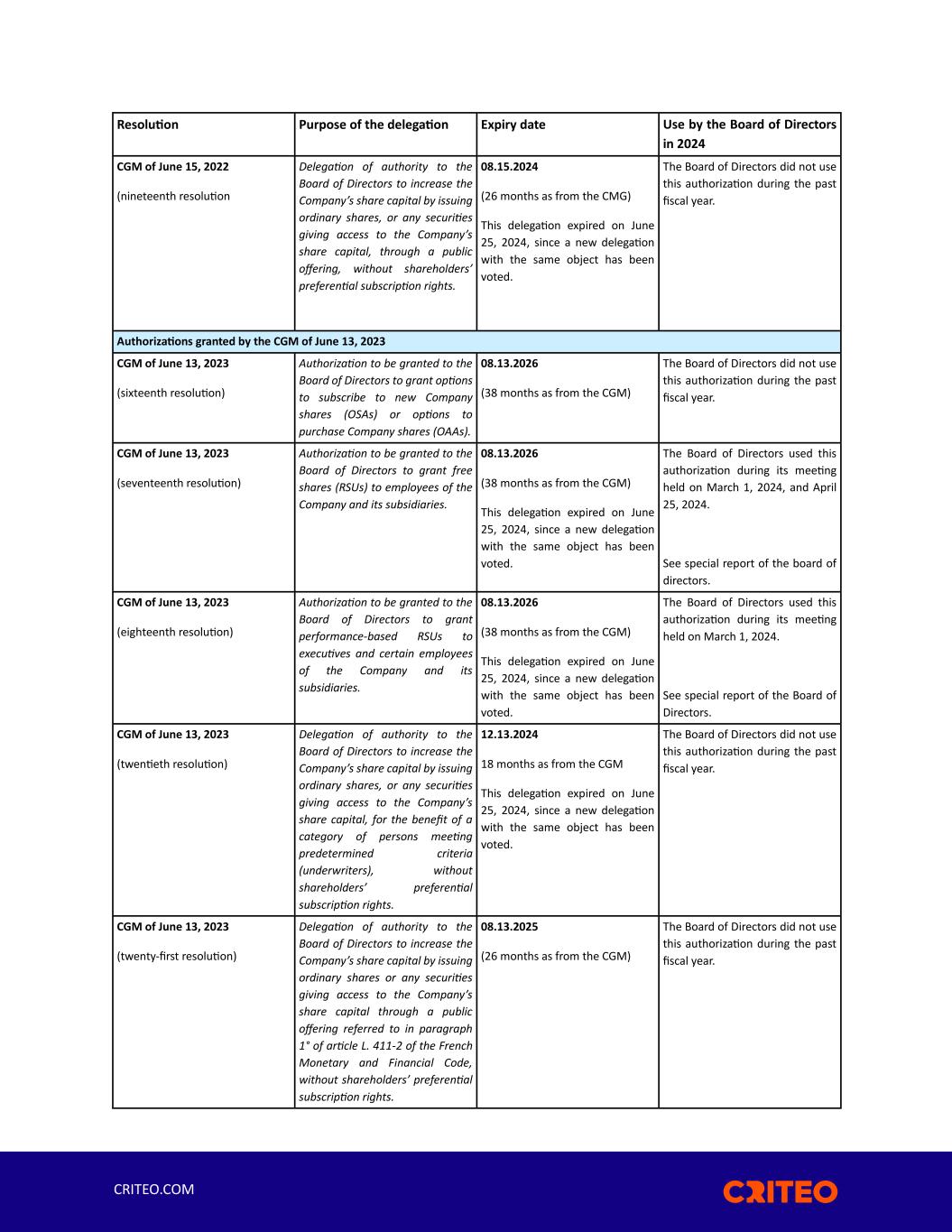 CRITEO.COM Resolution Purpose of the delegation Expiry date Use by the Board of Directors in 2024 CGM of June 13, 2023 (twenty-second resolution) Delegation of authority to the Board of Directors to increase the number of securities to be issued as a result of a share capital increase without preserving shareholders’ preferential subscription rights pursuant to the resolutions 20 and 21 of the CGM of June 13, 2023 (“green shoe”) 12.13.2024 (18 months as from the CGM) The Board of Directors did not use this authorization during the past fiscal year. CGM of June 13, 2023 (twenty-third resolution) Delegation of authority to the Board of Directors to increase the Company’s share capital through incorporation of premiums, reserves, profits or any other amounts that may be capitalized within the limit of a nominal amount of €158,122.82. 08.13.2025 (26 months as from the CGM) The Board of Directors did not use this authorization during the past fiscal year. CGM of June 13, 2023 (twenty-forth resolution) Delegation of authority to the Board of Directors to increase the Company’s share capital by way of issuing shares and securities giving access to the Company’s share capital for the benefit of members of a Company savings plan (plan d’épargne d’entreprise) 12.13.2024 (18 months as from the CGM) The Board of Directors did not use this authorization during the past fiscal year. Authorizations granted by the CGM of June 25, 2024 CGM of June 25, 2024 (fifteenth resolution) authorize the Board of Directors to grant time-based restricted stock units (“Time-Based RSUs”) to employees and corporate officers of the Company and employees of its subsidiaries 08.25.2027 (38 months as from the CGM) The Board of Directors used this authorization during its meeting held on July 24, 2024, October 24, 2024 and December 5, 2024. See special report of the Board of Directors. CGM of June 25, 2024 (sixteenth resolution) Authorize the Board of Directors to grant performance-based restricted stock units (“Performance-Based RSUs”) to employees and corporate officers of the Company and employees of its subsidiaries 08.25.2027 (38 months as from the CGM) The Board of Directors used this authorization during its meeting held on July 24, 2024. See special report of the board of directors. CGM of June 25, 2024 (eighteenth resolution) Delegate authority to the Board of Directors to increase the Company’s share capital by issuing ordinary shares, or any securities giving access to the Company’s share capital, for the benefit of a category of persons meeting predetermined criteria (underwriters), without shareholders’ preferential subscription rights 12.25.2025 (18 months as from the CGM) The Board of Directors did not use this authorization during the past fiscal year.