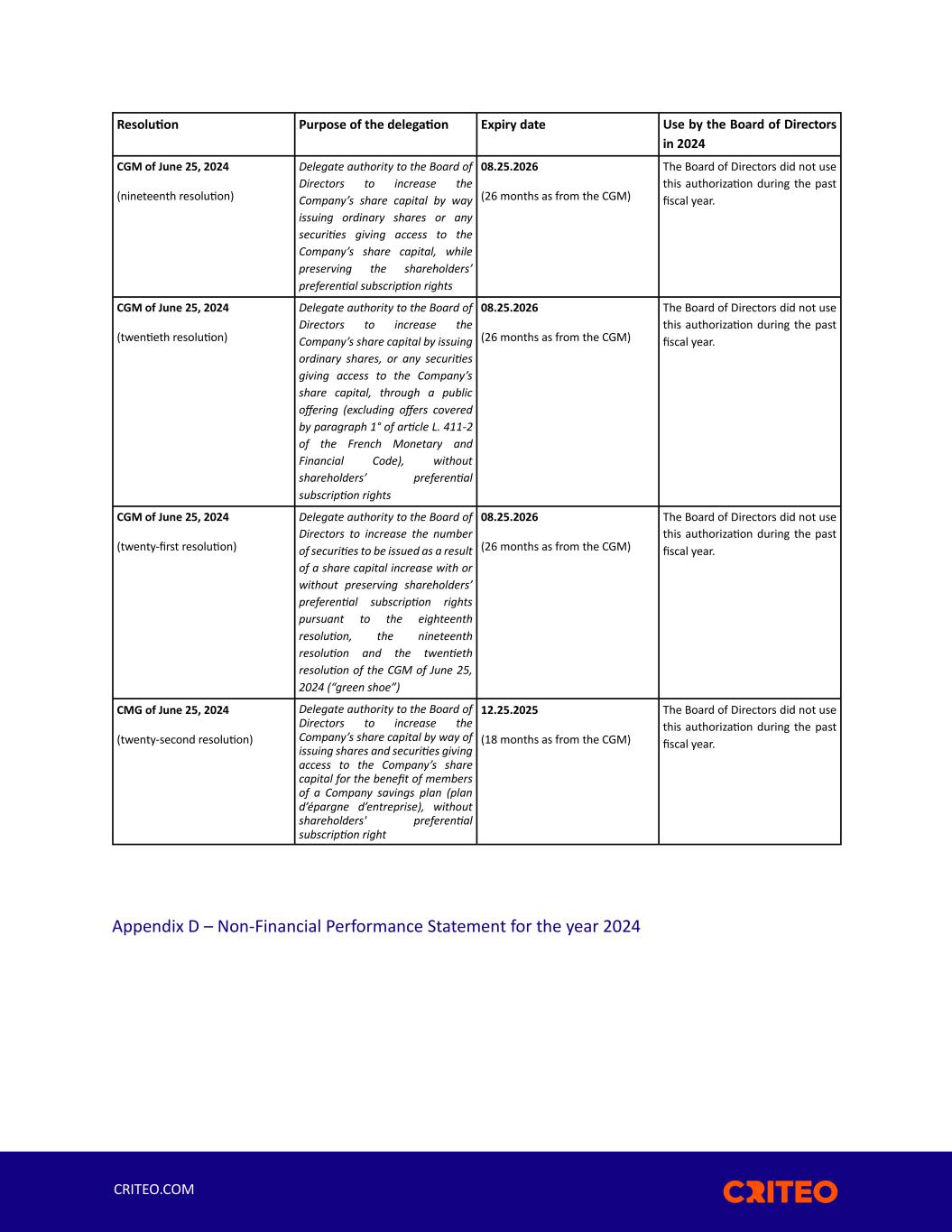 CRITEO.COM Resolution Purpose of the delegation Expiry date Use by the Board of Directors in 2024 CGM of June 25, 2024 (nineteenth resolution) Delegate authority to the Board of Directors to increase the Company’s share capital by way issuing ordinary shares or any securities giving access to the Company’s share capital, while preserving the shareholders’ preferential subscription rights 08.25.2026 (26 months as from the CGM) The Board of Directors did not use this authorization during the past fiscal year. CGM of June 25, 2024 (twentieth resolution) Delegate authority to the Board of Directors to increase the Company’s share capital by issuing ordinary shares, or any securities giving access to the Company’s share capital, through a public offering (excluding offers covered by paragraph 1° of article L. 411-2 of the French Monetary and Financial Code), without shareholders’ preferential subscription rights 08.25.2026 (26 months as from the CGM) The Board of Directors did not use this authorization during the past fiscal year. CGM of June 25, 2024 (twenty-first resolution) Delegate authority to the Board of Directors to increase the number of securities to be issued as a result of a share capital increase with or without preserving shareholders’ preferential subscription rights pursuant to the eighteenth resolution, the nineteenth resolution and the twentieth resolution of the CGM of June 25, 2024 (“green shoe”) 08.25.2026 (26 months as from the CGM) The Board of Directors did not use this authorization during the past fiscal year. CMG of June 25, 2024 (twenty-second resolution) Delegate authority to the Board of Directors to increase the Company’s share capital by way of issuing shares and securities giving access to the Company’s share capital for the benefit of members of a Company savings plan (plan d’épargne d’entreprise), without shareholders' preferential subscription right 12.25.2025 (18 months as from the CGM) The Board of Directors did not use this authorization during the past fiscal year. Appendix D – Non-Financial Performance Statement for the year 2024