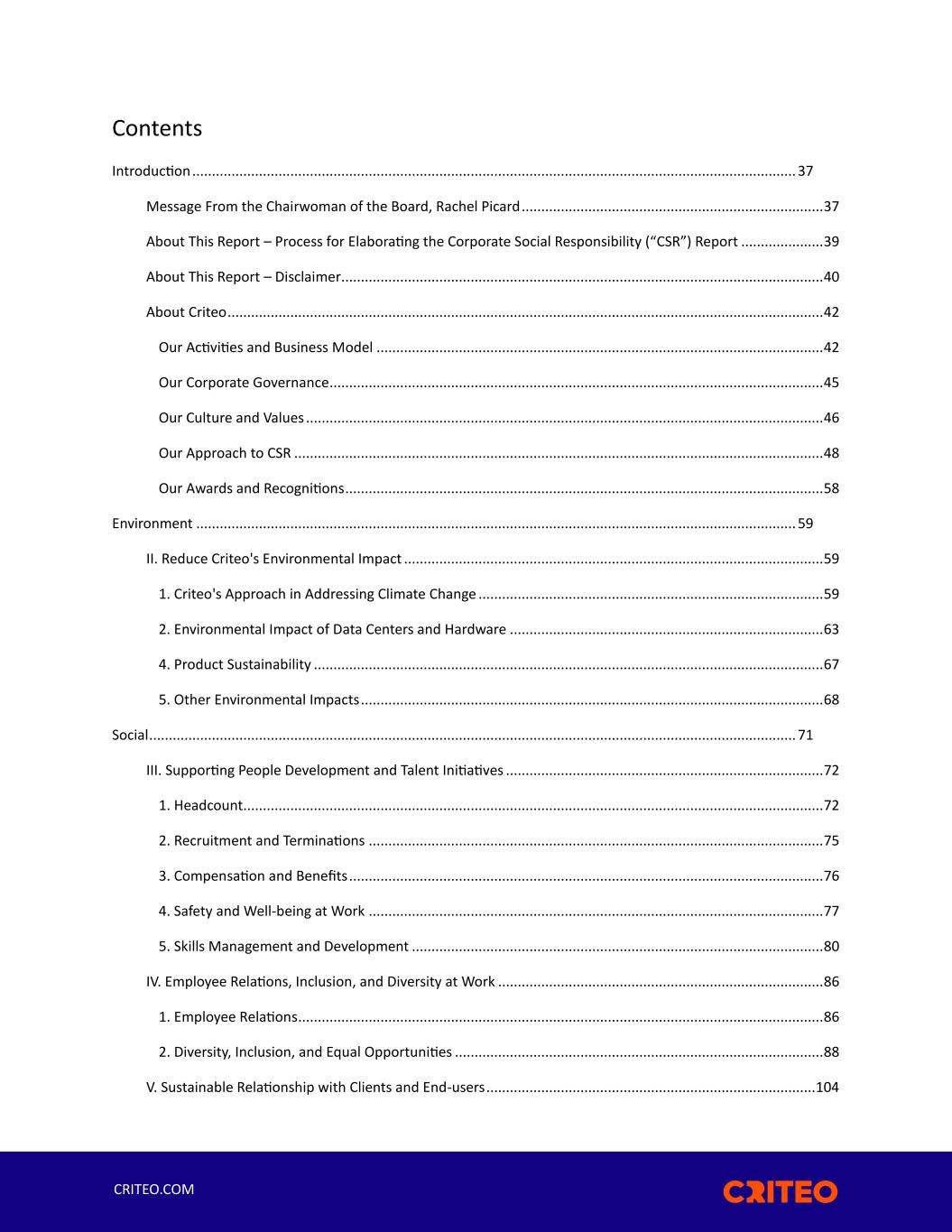 CRITEO.COM SUSTAINABILITY STATEMENT ESRS TOPICS ESRS SUB-TOPICS CONCORDANCE Social Information ESRS S1 – Own Workforce Working Conditions III. Supporting People Development and Talent Initiatives 1. Headcount 2. Recruitment and Terminations 3. Compensation and Benefits 4. Safety and Well-being at Work Equal Treatment and Opportunities for all 5. Skills Management and Development a. Instructors-led Training 2024 Highlights b. Online Training 2024 Highlights c. Criteo's Coaching Offer d. Criteo's Mentoring Offer e. Hackathon IV. Employee relations, Inclusion, and Diversity at Work 1. Employee Relations a. Internal Communication b. Culture of Feedback and Engagement c. Employee Recognition 2. Diversity, Inclusion, and Equal Opportunities a. Criteo's Strategy for DEI b. Presentation of Criteo Cares Program c. Gender Equality at Criteo d. Inclusion of the LGBTQIA+ Community e. Parenthood Support at Criteo f. Social Diversity g. People with Disabilities h. Inclusion for the BIPOC Community i. Non-Discrimination and Prevention of Harassment ESRS S2- Workers in the value chain value chain workers connected with the undertaking’s own operations and value chain, including through its products or services, as well as through its business relationships Not material