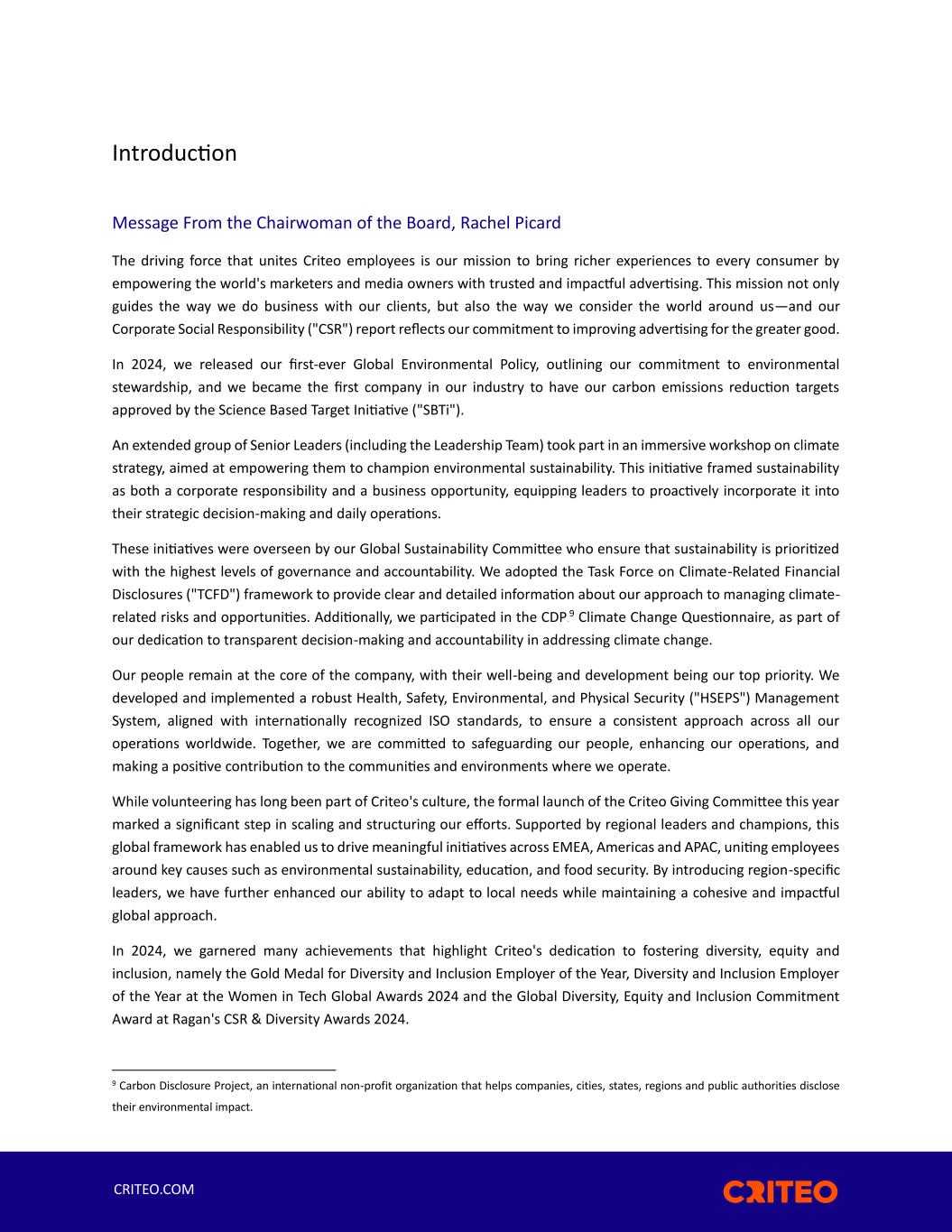 CRITEO.COM Introduction Message From the Chairwoman of the Board, Rachel Picard The driving force that unites Criteo employees is our mission to bring richer experiences to every consumer by empowering the world's marketers and media owners with trusted and impactful advertising. This mission not only guides the way we do business with our clients, but also the way we consider the world around us—and our Corporate Social Responsibility ("CSR") report reflects our commitment to improving advertising for the greater good. In 2024, we released our first-ever Global Environmental Policy, outlining our commitment to environmental stewardship, and we became the first company in our industry to have our carbon emissions reduction targets approved by the Science Based Target Initiative ("SBTi"). An extended group of Senior Leaders (including the Leadership Team) took part in an immersive workshop on climate strategy, aimed at empowering them to champion environmental sustainability. This initiative framed sustainability as both a corporate responsibility and a business opportunity, equipping leaders to proactively incorporate it into their strategic decision-making and daily operations. These initiatives were overseen by our Global Sustainability Committee who ensure that sustainability is prioritized with the highest levels of governance and accountability. We adopted the Task Force on Climate-Related Financial Disclosures ("TCFD") framework to provide clear and detailed information about our approach to managing climate- related risks and opportunities. Additionally, we participated in the CDP 8F 9 Climate Change Questionnaire, as part of our dedication to transparent decision-making and accountability in addressing climate change. Our people remain at the core of the company, with their well-being and development being our top priority. We developed and implemented a robust Health, Safety, Environmental, and Physical Security ("HSEPS") Management System, aligned with internationally recognized ISO standards, to ensure a consistent approach across all our operations worldwide. Together, we are committed to safeguarding our people, enhancing our operations, and making a positive contribution to the communities and environments where we operate. While volunteering has long been part of Criteo's culture, the formal launch of the Criteo Giving Committee this year marked a significant step in scaling and structuring our efforts. Supported by regional leaders and champions, this global framework has enabled us to drive meaningful initiatives across EMEA, Americas and APAC, uniting employees around key causes such as environmental sustainability, education, and food security. By introducing region-specific leaders, we have further enhanced our ability to adapt to local needs while maintaining a cohesive and impactful global approach. In 2024, we garnered many achievements that highlight Criteo's dedication to fostering diversity, equity and inclusion, namely the Gold Medal for Diversity and Inclusion Employer of the Year, Diversity and Inclusion Employer of the Year at the Women in Tech Global Awards 2024 and the Global Diversity, Equity and Inclusion Commitment Award at Ragan's CSR & Diversity Awards 2024. 9 Carbon Disclosure Project, an international non-profit organization that helps companies, cities, states, regions and public authorities disclose their environmental impact.