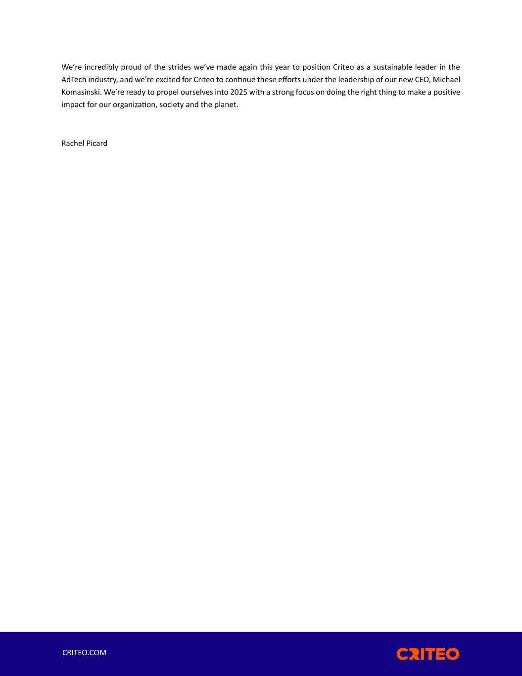CRITEO.COM We’re incredibly proud of the strides we’ve made again this year to position Criteo as a sustainable leader in the AdTech industry, and we’re excited for Criteo to continue these efforts under the leadership of our new CEO, Michael Komasinski. We’re ready to propel ourselves into 2025 with a strong focus on doing the right thing to make a positive impact for our organization, society and the planet. Rachel Picard