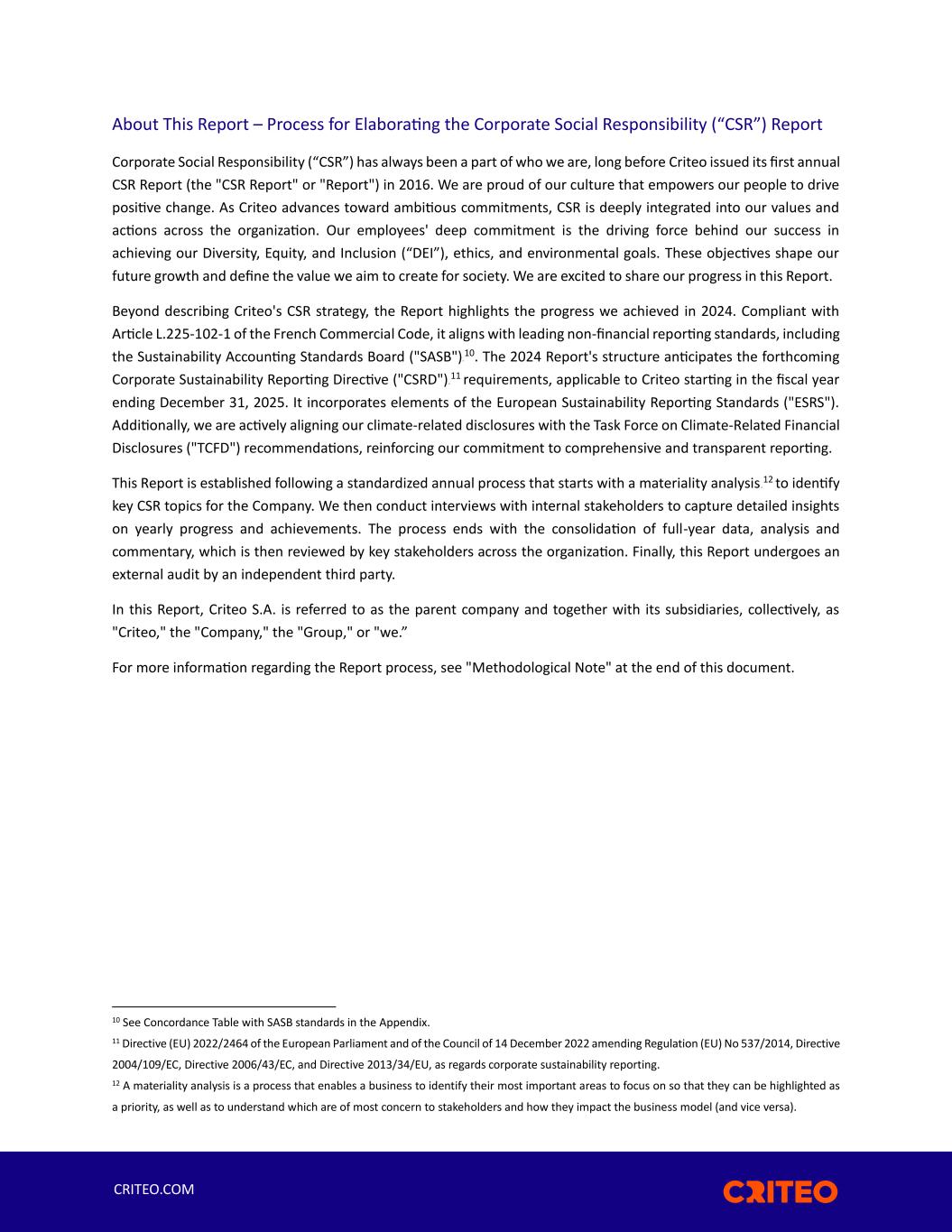 CRITEO.COM About This Report – Process for Elaborating the Corporate Social Responsibility (“CSR”) Report Corporate Social Responsibility (“CSR”) has always been a part of who we are, long before Criteo issued its first annual CSR Report (the "CSR Report" or "Report") in 2016. We are proud of our culture that empowers our people to drive positive change. As Criteo advances toward ambitious commitments, CSR is deeply integrated into our values and actions across the organization. Our employees' deep commitment is the driving force behind our success in achieving our Diversity, Equity, and Inclusion (“DEI”), ethics, and environmental goals. These objectives shape our future growth and define the value we aim to create for society. We are excited to share our progress in this Report. Beyond describing Criteo's CSR strategy, the Report highlights the progress we achieved in 2024. Compliant with Article L.225-102-1 of the French Commercial Code, it aligns with leading non-financial reporting standards, including the Sustainability Accounting Standards Board ("SASB") 9F 10. The 2024 Report's structure anticipates the forthcoming Corporate Sustainability Reporting Directive ("CSRD")10F 11 requirements, applicable to Criteo starting in the fiscal year ending December 31, 2025. It incorporates elements of the European Sustainability Reporting Standards ("ESRS"). Additionally, we are actively aligning our climate-related disclosures with the Task Force on Climate-Related Financial Disclosures ("TCFD") recommendations, reinforcing our commitment to comprehensive and transparent reporting. This Report is established following a standardized annual process that starts with a materiality analysis 11F 12 to identify key CSR topics for the Company. We then conduct interviews with internal stakeholders to capture detailed insights on yearly progress and achievements. The process ends with the consolidation of full-year data, analysis and commentary, which is then reviewed by key stakeholders across the organization. Finally, this Report undergoes an external audit by an independent third party. In this Report, Criteo S.A. is referred to as the parent company and together with its subsidiaries, collectively, as "Criteo," the "Company," the "Group," or "we.” For more information regarding the Report process, see "Methodological Note" at the end of this document. 10 See Concordance Table with SASB standards in the Appendix. 11 Directive (EU) 2022/2464 of the European Parliament and of the Council of 14 December 2022 amending Regulation (EU) No 537/2014, Directive 2004/109/EC, Directive 2006/43/EC, and Directive 2013/34/EU, as regards corporate sustainability reporting. 12 A materiality analysis is a process that enables a business to identify their most important areas to focus on so that they can be highlighted as a priority, as well as to understand which are of most concern to stakeholders and how they impact the business model (and vice versa).