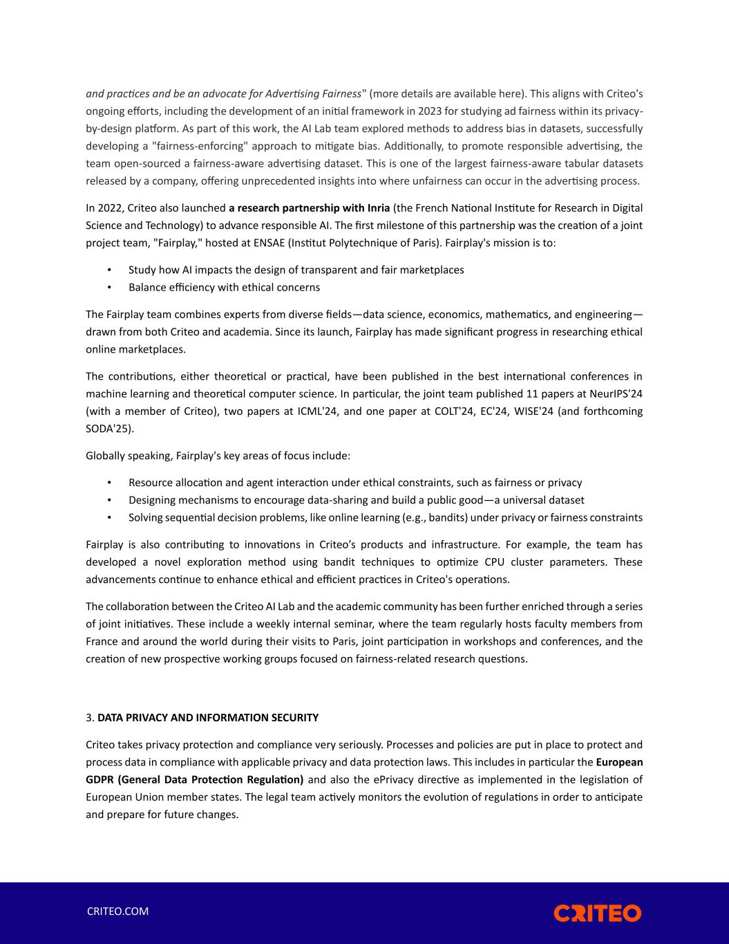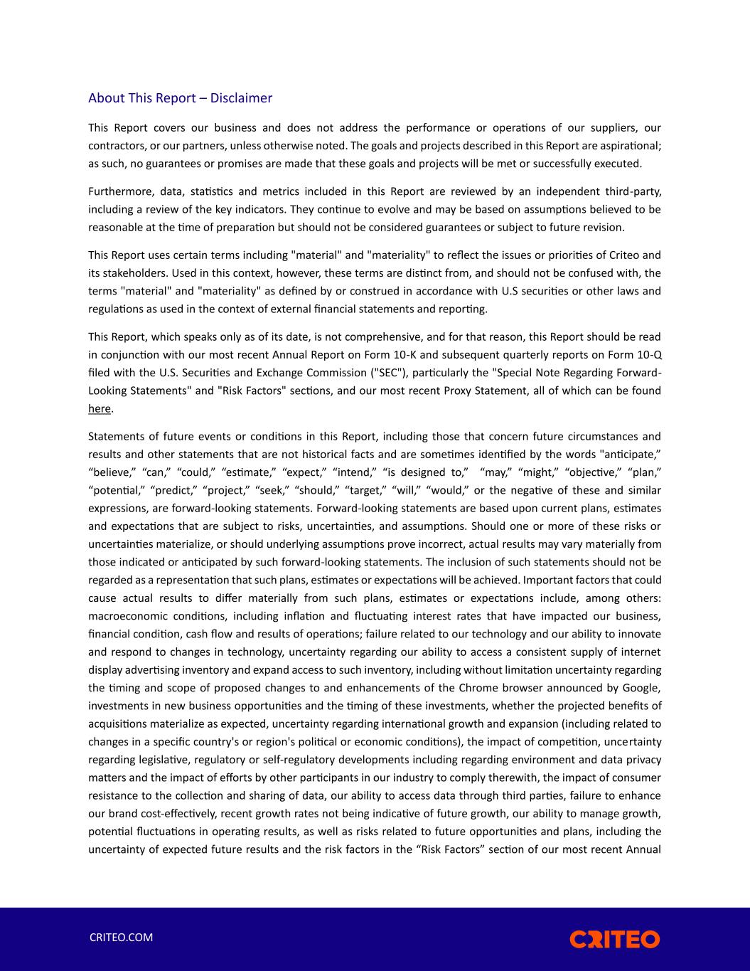 CRITEO.COM About This Report – Disclaimer This Report covers our business and does not address the performance or operations of our suppliers, our contractors, or our partners, unless otherwise noted. The goals and projects described in this Report are aspirational; as such, no guarantees or promises are made that these goals and projects will be met or successfully executed. Furthermore, data, statistics and metrics included in this Report are reviewed by an independent third-party, including a review of the key indicators. They continue to evolve and may be based on assumptions believed to be reasonable at the time of preparation but should not be considered guarantees or subject to future revision. This Report uses certain terms including "material" and "materiality" to reflect the issues or priorities of Criteo and its stakeholders. Used in this context, however, these terms are distinct from, and should not be confused with, the terms "material" and "materiality" as defined by or construed in accordance with U.S securities or other laws and regulations as used in the context of external financial statements and reporting. This Report, which speaks only as of its date, is not comprehensive, and for that reason, this Report should be read in conjunction with our most recent Annual Report on Form 10-K and subsequent quarterly reports on Form 10-Q filed with the U.S. Securities and Exchange Commission ("SEC"), particularly the "Special Note Regarding Forward- Looking Statements" and "Risk Factors" sections, and our most recent Proxy Statement, all of which can be found here. Statements of future events or conditions in this Report, including those that concern future circumstances and results and other statements that are not historical facts and are sometimes identified by the words "anticipate,” “believe,” “can,” “could,” “estimate,” “expect,” “intend,” “is designed to,” “may,” “might,” “objective,” “plan,” “potential,” “predict,” “project,” “seek,” “should,” “target,” “will,” “would,” or the negative of these and similar expressions, are forward-looking statements. Forward-looking statements are based upon current plans, estimates and expectations that are subject to risks, uncertainties, and assumptions. Should one or more of these risks or uncertainties materialize, or should underlying assumptions prove incorrect, actual results may vary materially from those indicated or anticipated by such forward-looking statements. The inclusion of such statements should not be regarded as a representation that such plans, estimates or expectations will be achieved. Important factors that could cause actual results to differ materially from such plans, estimates or expectations include, among others: macroeconomic conditions, including inflation and fluctuating interest rates that have impacted our business, financial condition, cash flow and results of operations; failure related to our technology and our ability to innovate and respond to changes in technology, uncertainty regarding our ability to access a consistent supply of internet display advertising inventory and expand access to such inventory, including without limitation uncertainty regarding the timing and scope of proposed changes to and enhancements of the Chrome browser announced by Google, investments in new business opportunities and the timing of these investments, whether the projected benefits of acquisitions materialize as expected, uncertainty regarding international growth and expansion (including related to changes in a specific country's or region's political or economic conditions), the impact of competition, uncertainty regarding legislative, regulatory or self-regulatory developments including regarding environment and data privacy matters and the impact of efforts by other participants in our industry to comply therewith, the impact of consumer resistance to the collection and sharing of data, our ability to access data through third parties, failure to enhance our brand cost-effectively, recent growth rates not being indicative of future growth, our ability to manage growth, potential fluctuations in operating results, as well as risks related to future opportunities and plans, including the uncertainty of expected future results and the risk factors in the “Risk Factors” section of our most recent Annual