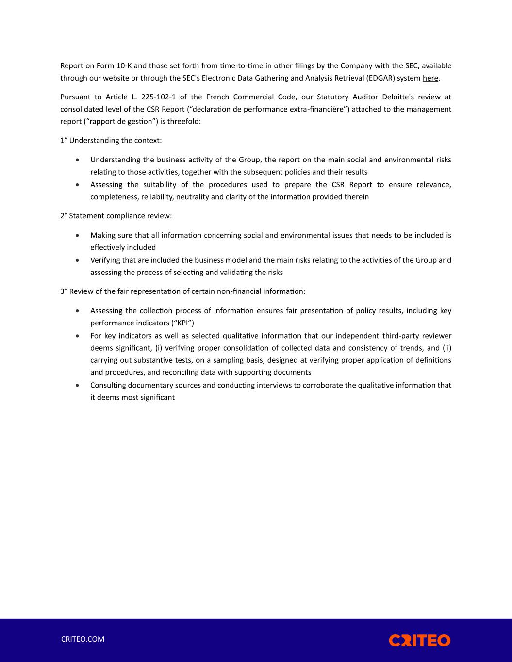 CRITEO.COM Report on Form 10-K and those set forth from time-to-time in other filings by the Company with the SEC, available through our website or through the SEC's Electronic Data Gathering and Analysis Retrieval (EDGAR) system here. Pursuant to Article L. 225-102-1 of the French Commercial Code, our Statutory Auditor Deloitte's review at consolidated level of the CSR Report (“declaration de performance extra-financière”) attached to the management report (“rapport de gestion”) is threefold: 1° Understanding the context: • Understanding the business activity of the Group, the report on the main social and environmental risks relating to those activities, together with the subsequent policies and their results • Assessing the suitability of the procedures used to prepare the CSR Report to ensure relevance, completeness, reliability, neutrality and clarity of the information provided therein 2° Statement compliance review: • Making sure that all information concerning social and environmental issues that needs to be included is effectively included • Verifying that are included the business model and the main risks relating to the activities of the Group and assessing the process of selecting and validating the risks 3° Review of the fair representation of certain non-financial information: • Assessing the collection process of information ensures fair presentation of policy results, including key performance indicators (“KPI”) • For key indicators as well as selected qualitative information that our independent third-party reviewer deems significant, (i) verifying proper consolidation of collected data and consistency of trends, and (ii) carrying out substantive tests, on a sampling basis, designed at verifying proper application of definitions and procedures, and reconciling data with supporting documents • Consulting documentary sources and conducting interviews to corroborate the qualitative information that it deems most significant