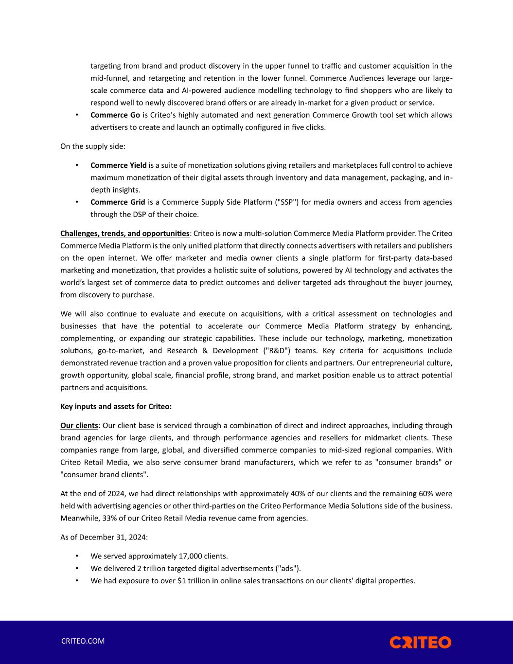 CRITEO.COM targeting from brand and product discovery in the upper funnel to traffic and customer acquisition in the mid-funnel, and retargeting and retention in the lower funnel. Commerce Audiences leverage our large- scale commerce data and AI-powered audience modelling technology to find shoppers who are likely to respond well to newly discovered brand offers or are already in-market for a given product or service. • Commerce Go is Criteo's highly automated and next generation Commerce Growth tool set which allows advertisers to create and launch an optimally configured in five clicks. On the supply side: • Commerce Yield is a suite of monetization solutions giving retailers and marketplaces full control to achieve maximum monetization of their digital assets through inventory and data management, packaging, and in- depth insights. • Commerce Grid is a Commerce Supply Side Platform ("SSP") for media owners and access from agencies through the DSP of their choice. Challenges, trends, and opportunities: Criteo is now a multi-solution Commerce Media Platform provider. The Criteo Commerce Media Platform is the only unified platform that directly connects advertisers with retailers and publishers on the open internet. We offer marketer and media owner clients a single platform for first-party data-based marketing and monetization, that provides a holistic suite of solutions, powered by AI technology and activates the world’s largest set of commerce data to predict outcomes and deliver targeted ads throughout the buyer journey, from discovery to purchase. We will also continue to evaluate and execute on acquisitions, with a critical assessment on technologies and businesses that have the potential to accelerate our Commerce Media Platform strategy by enhancing, complementing, or expanding our strategic capabilities. These include our technology, marketing, monetization solutions, go-to-market, and Research & Development ("R&D") teams. Key criteria for acquisitions include demonstrated revenue traction and a proven value proposition for clients and partners. Our entrepreneurial culture, growth opportunity, global scale, financial profile, strong brand, and market position enable us to attract potential partners and acquisitions. Key inputs and assets for Criteo: Our clients: Our client base is serviced through a combination of direct and indirect approaches, including through brand agencies for large clients, and through performance agencies and resellers for midmarket clients. These companies range from large, global, and diversified commerce companies to mid-sized regional companies. With Criteo Retail Media, we also serve consumer brand manufacturers, which we refer to as "consumer brands" or "consumer brand clients". At the end of 2024, we had direct relationships with approximately 40% of our clients and the remaining 60% were held with advertising agencies or other third-parties on the Criteo Performance Media Solutions side of the business. Meanwhile, 33% of our Criteo Retail Media revenue came from agencies. As of December 31, 2024: • We served approximately 17,000 clients. • We delivered 2 trillion targeted digital advertisements ("ads"). • We had exposure to over $1 trillion in online sales transactions on our clients' digital properties.