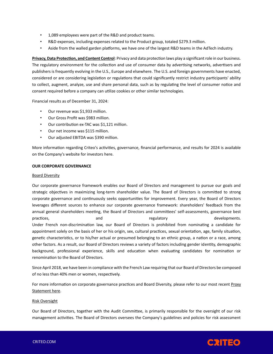 CRITEO.COM • 1,089 employees were part of the R&D and product teams. • R&D expenses, including expenses related to the Product group, totaled $279.3 million. • Aside from the walled garden platforms, we have one of the largest R&D teams in the AdTech industry. Privacy, Data Protection, and Content Control: Privacy and data protection laws play a significant role in our business. The regulatory environment for the collection and use of consumer data by advertising networks, advertisers and publishers is frequently evolving in the U.S., Europe and elsewhere. The U.S. and foreign governments have enacted, considered or are considering legislation or regulations that could significantly restrict industry participants' ability to collect, augment, analyze, use and share personal data, such as by regulating the level of consumer notice and consent required before a company can utilize cookies or other similar technologies. Financial results as of December 31, 2024: • Our revenue was $1,933 million. • Our Gross Profit was $983 million. • Our contribution ex-TAC was $1,121 million. • Our net income was $115 million. • Our adjusted EBITDA was $390 million. More information regarding Criteo's activities, governance, financial performance, and results for 2024 is available on the Company's website for investors here. OUR CORPORATE GOVERNANCE Board Diversity Our corporate governance framework enables our Board of Directors and management to pursue our goals and strategic objectives in maximizing long-term shareholder value. The Board of Directors is committed to strong corporate governance and continuously seeks opportunities for improvement. Every year, the Board of Directors leverages different sources to enhance our corporate governance framework: shareholders' feedback from the annual general shareholders meeting, the Board of Directors and committees' self-assessments, governance best practices, and regulatory developments. Under French non-discrimination law, our Board of Directors is prohibited from nominating a candidate for appointment solely on the basis of her or his origin, sex, cultural practices, sexual orientation, age, family situation, genetic characteristics, or to his/her actual or presumed belonging to an ethnic group, a nation or a race, among other factors. As a result, our Board of Directors reviews a variety of factors including gender identity, demographic background, professional experience, skills and education when evaluating candidates for nomination or renomination to the Board of Directors. Since April 2018, we have been in compliance with the French Law requiring that our Board of Directors be composed of no less than 40% men or women, respectively. For more information on corporate governance practices and Board Diversity, please refer to our most recent Proxy Statement here. Risk Oversight Our Board of Directors, together with the Audit Committee, is primarily responsible for the oversight of our risk management activities. The Board of Directors oversees the Company's guidelines and policies for risk assessment