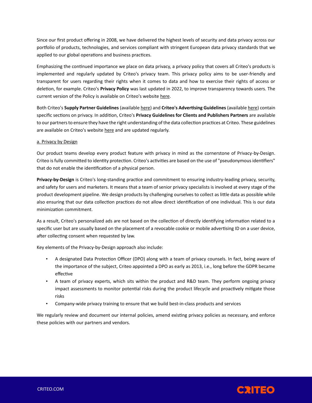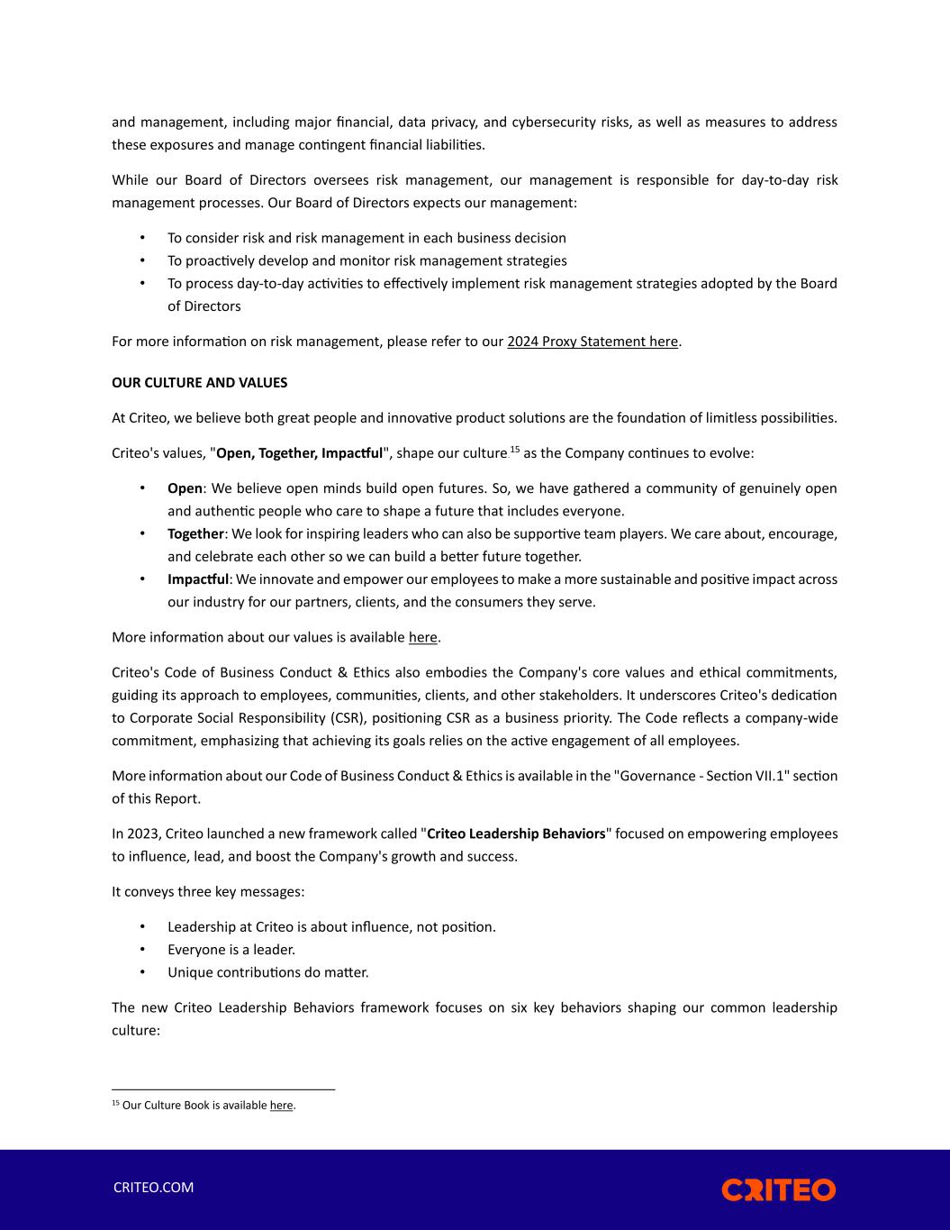 CRITEO.COM and management, including major financial, data privacy, and cybersecurity risks, as well as measures to address these exposures and manage contingent financial liabilities. While our Board of Directors oversees risk management, our management is responsible for day-to-day risk management processes. Our Board of Directors expects our management: • To consider risk and risk management in each business decision • To proactively develop and monitor risk management strategies • To process day-to-day activities to effectively implement risk management strategies adopted by the Board of Directors For more information on risk management, please refer to our 2024 Proxy Statement here. OUR CULTURE AND VALUES At Criteo, we believe both great people and innovative product solutions are the foundation of limitless possibilities. Criteo's values, "Open, Together, Impactful", shape our culture14F 15 as the Company continues to evolve: • Open: We believe open minds build open futures. So, we have gathered a community of genuinely open and authentic people who care to shape a future that includes everyone. • Together: We look for inspiring leaders who can also be supportive team players. We care about, encourage, and celebrate each other so we can build a better future together. • Impactful: We innovate and empower our employees to make a more sustainable and positive impact across our industry for our partners, clients, and the consumers they serve. More information about our values is available here. Criteo's Code of Business Conduct & Ethics also embodies the Company's core values and ethical commitments, guiding its approach to employees, communities, clients, and other stakeholders. It underscores Criteo's dedication to Corporate Social Responsibility (CSR), positioning CSR as a business priority. The Code reflects a company-wide commitment, emphasizing that achieving its goals relies on the active engagement of all employees. More information about our Code of Business Conduct & Ethics is available in the "Governance - Section VII.1" section of this Report. In 2023, Criteo launched a new framework called "Criteo Leadership Behaviors" focused on empowering employees to influence, lead, and boost the Company's growth and success. It conveys three key messages: • Leadership at Criteo is about influence, not position. • Everyone is a leader. • Unique contributions do matter. The new Criteo Leadership Behaviors framework focuses on six key behaviors shaping our common leadership culture: 15 Our Culture Book is available here.