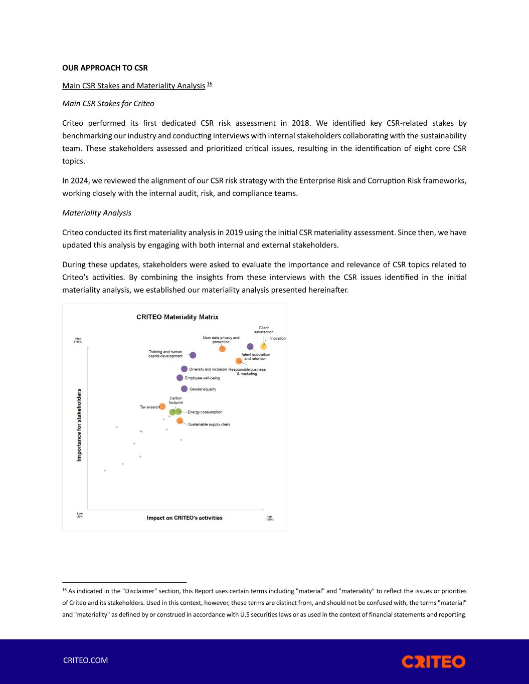 CRITEO.COM OUR APPROACH TO CSR Main CSR Stakes and Materiality Analysis15F 16 Main CSR Stakes for Criteo Criteo performed its first dedicated CSR risk assessment in 2018. We identified key CSR-related stakes by benchmarking our industry and conducting interviews with internal stakeholders collaborating with the sustainability team. These stakeholders assessed and prioritized critical issues, resulting in the identification of eight core CSR topics. In 2024, we reviewed the alignment of our CSR risk strategy with the Enterprise Risk and Corruption Risk frameworks, working closely with the internal audit, risk, and compliance teams. Materiality Analysis Criteo conducted its first materiality analysis in 2019 using the initial CSR materiality assessment. Since then, we have updated this analysis by engaging with both internal and external stakeholders. During these updates, stakeholders were asked to evaluate the importance and relevance of CSR topics related to Criteo's activities. By combining the insights from these interviews with the CSR issues identified in the initial materiality analysis, we established our materiality analysis presented hereinafter. 16 As indicated in the "Disclaimer" section, this Report uses certain terms including "material" and "materiality" to reflect the issues or priorities of Criteo and its stakeholders. Used in this context, however, these terms are distinct from, and should not be confused with, the terms "material" and "materiality" as defined by or construed in accordance with U.S securities laws or as used in the context of financial statements and reporting.