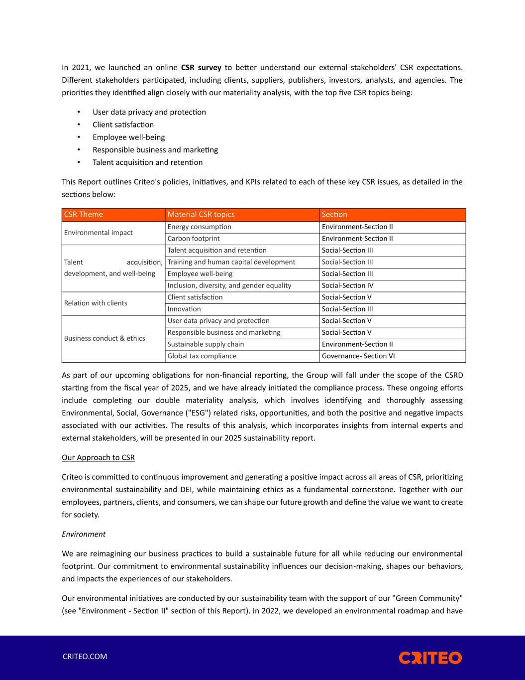 CRITEO.COM In 2021, we launched an online CSR survey to better understand our external stakeholders' CSR expectations. Different stakeholders participated, including clients, suppliers, publishers, investors, analysts, and agencies. The priorities they identified align closely with our materiality analysis, with the top five CSR topics being: • User data privacy and protection • Client satisfaction • Employee well-being • Responsible business and marketing • Talent acquisition and retention This Report outlines Criteo's policies, initiatives, and KPIs related to each of these key CSR issues, as detailed in the sections below: CSR Theme Material CSR topics Section Environmental impact Energy consumption Environment-Section II Carbon footprint Environment-Section II Talent acquisition, development, and well-being Talent acquisition and retention Social-Section III Training and human capital development Social-Section III Employee well-being Social-Section III Inclusion, diversity, and gender equality Social-Section IV Relation with clients Client satisfaction Social-Section V Innovation Social-Section III Business conduct & ethics User data privacy and protection Social-Section V Responsible business and marketing Social-Section V Sustainable supply chain Environment-Section II Global tax compliance Governance- Section VI As part of our upcoming obligations for non-financial reporting, the Group will fall under the scope of the CSRD starting from the fiscal year of 2025, and we have already initiated the compliance process. These ongoing efforts include completing our double materiality analysis, which involves identifying and thoroughly assessing Environmental, Social, Governance ("ESG") related risks, opportunities, and both the positive and negative impacts associated with our activities. The results of this analysis, which incorporates insights from internal experts and external stakeholders, will be presented in our 2025 sustainability report. Our Approach to CSR Criteo is committed to continuous improvement and generating a positive impact across all areas of CSR, prioritizing environmental sustainability and DEI, while maintaining ethics as a fundamental cornerstone. Together with our employees, partners, clients, and consumers, we can shape our future growth and define the value we want to create for society. Environment We are reimagining our business practices to build a sustainable future for all while reducing our environmental footprint. Our commitment to environmental sustainability influences our decision-making, shapes our behaviors, and impacts the experiences of our stakeholders. Our environmental initiatives are conducted by our sustainability team with the support of our "Green Community" (see "Environment - Section II" section of this Report). In 2022, we developed an environmental roadmap and have
