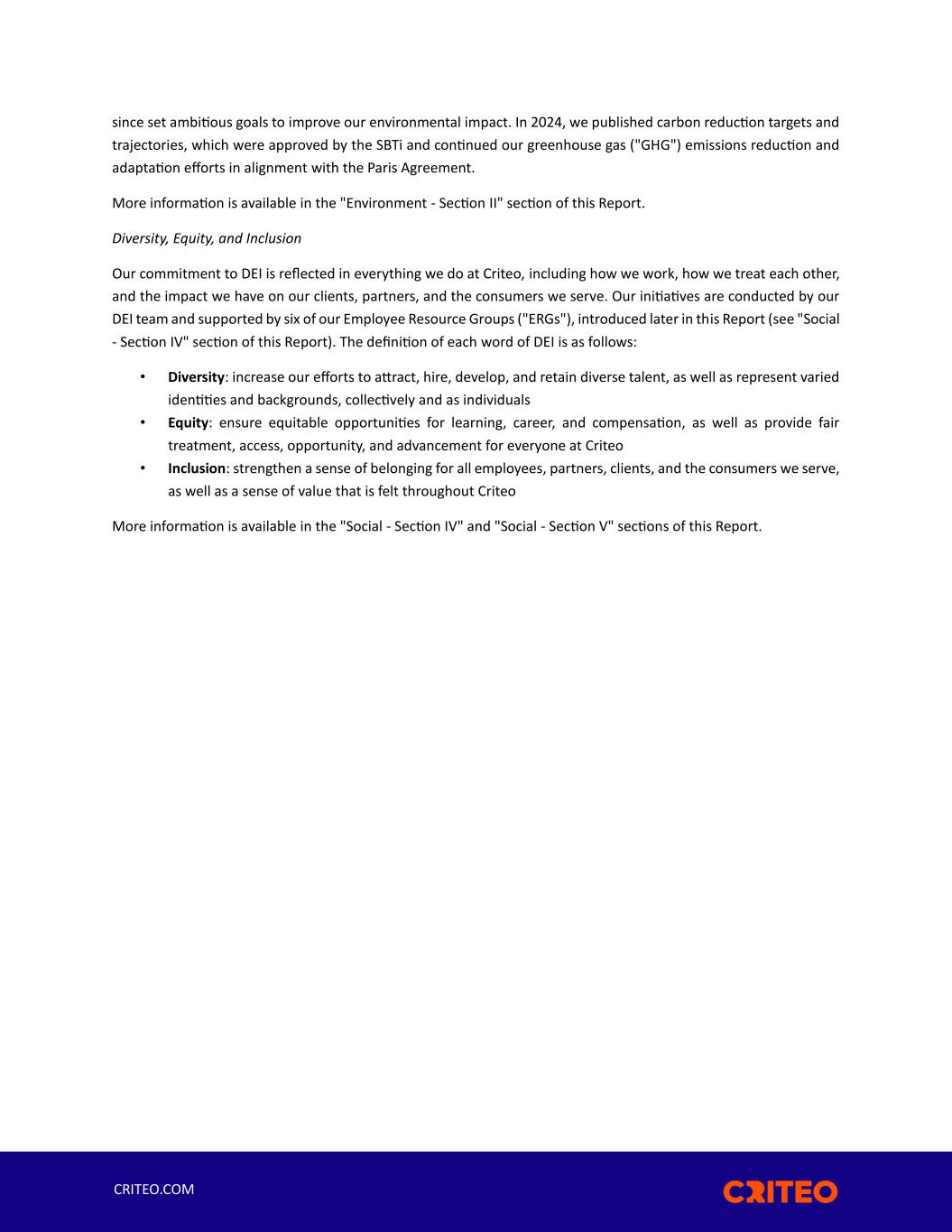 CRITEO.COM since set ambitious goals to improve our environmental impact. In 2024, we published carbon reduction targets and trajectories, which were approved by the SBTi and continued our greenhouse gas ("GHG") emissions reduction and adaptation efforts in alignment with the Paris Agreement. More information is available in the "Environment - Section II" section of this Report. Diversity, Equity, and Inclusion Our commitment to DEI is reflected in everything we do at Criteo, including how we work, how we treat each other, and the impact we have on our clients, partners, and the consumers we serve. Our initiatives are conducted by our DEI team and supported by six of our Employee Resource Groups ("ERGs"), introduced later in this Report (see "Social - Section IV" section of this Report). The definition of each word of DEI is as follows: • Diversity: increase our efforts to attract, hire, develop, and retain diverse talent, as well as represent varied identities and backgrounds, collectively and as individuals • Equity: ensure equitable opportunities for learning, career, and compensation, as well as provide fair treatment, access, opportunity, and advancement for everyone at Criteo • Inclusion: strengthen a sense of belonging for all employees, partners, clients, and the consumers we serve, as well as a sense of value that is felt throughout Criteo More information is available in the "Social - Section IV" and "Social - Section V" sections of this Report.