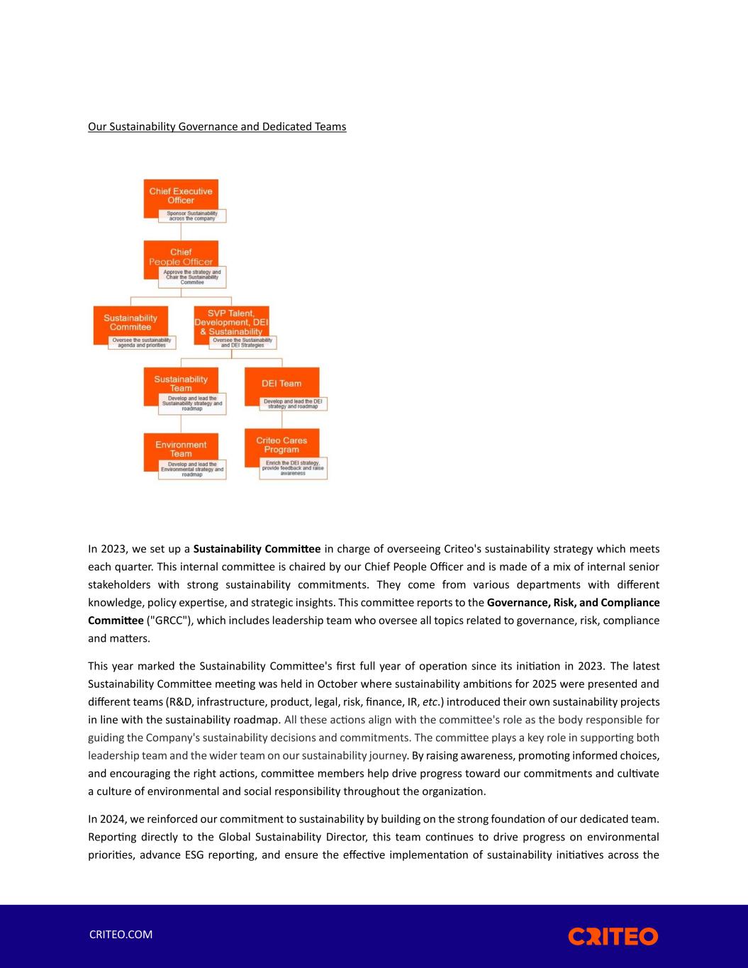 CRITEO.COM Our Sustainability Governance and Dedicated Teams In 2023, we set up a Sustainability Committee in charge of overseeing Criteo's sustainability strategy which meets each quarter. This internal committee is chaired by our Chief People Officer and is made of a mix of internal senior stakeholders with strong sustainability commitments. They come from various departments with different knowledge, policy expertise, and strategic insights. This committee reports to the Governance, Risk, and Compliance Committee ("GRCC"), which includes leadership team who oversee all topics related to governance, risk, compliance and matters. This year marked the Sustainability Committee's first full year of operation since its initiation in 2023. The latest Sustainability Committee meeting was held in October where sustainability ambitions for 2025 were presented and different teams (R&D, infrastructure, product, legal, risk, finance, IR, etc.) introduced their own sustainability projects in line with the sustainability roadmap. All these actions align with the committee's role as the body responsible for guiding the Company's sustainability decisions and commitments. The committee plays a key role in supporting both leadership team and the wider team on our sustainability journey. By raising awareness, promoting informed choices, and encouraging the right actions, committee members help drive progress toward our commitments and cultivate a culture of environmental and social responsibility throughout the organization. In 2024, we reinforced our commitment to sustainability by building on the strong foundation of our dedicated team. Reporting directly to the Global Sustainability Director, this team continues to drive progress on environmental priorities, advance ESG reporting, and ensure the effective implementation of sustainability initiatives across the