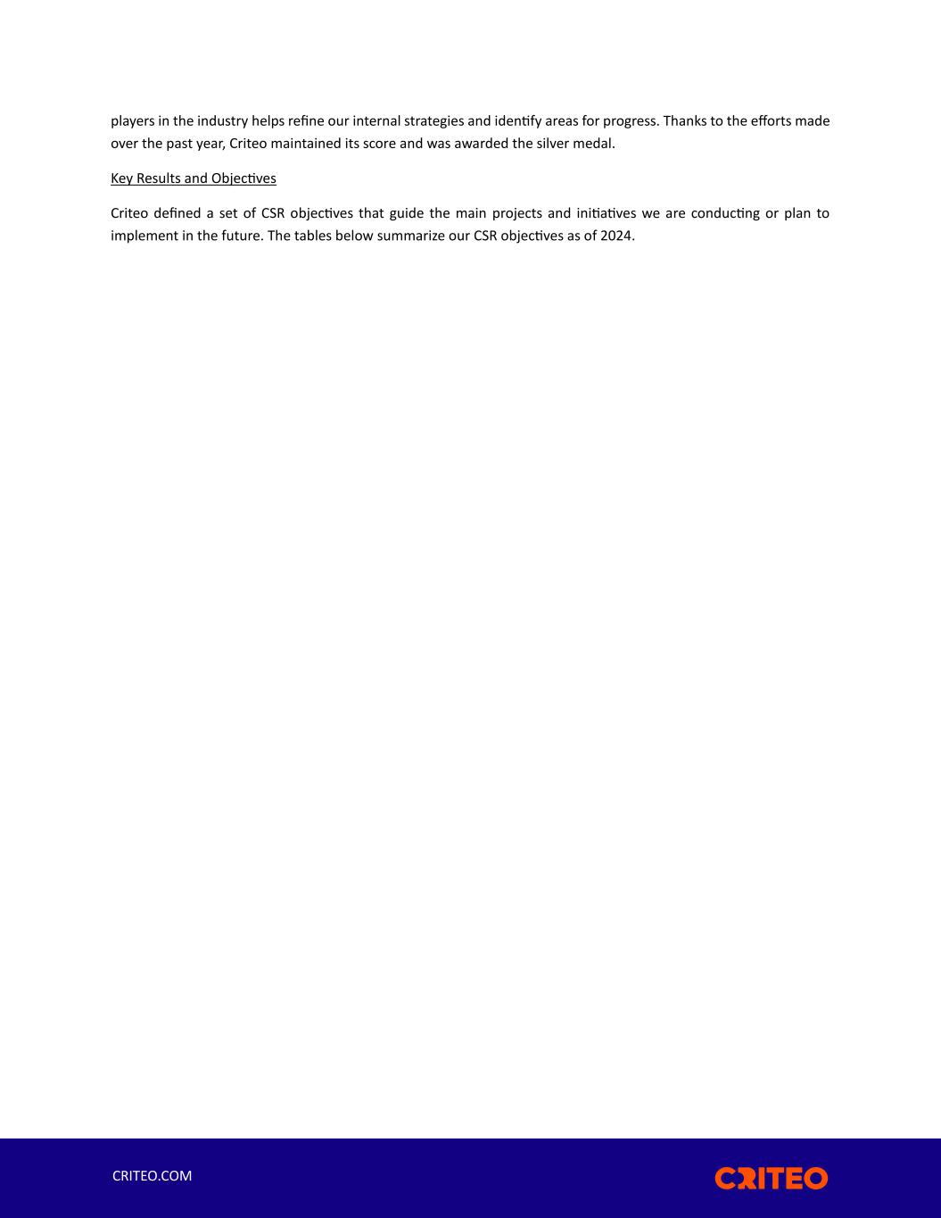 CRITEO.COM players in the industry helps refine our internal strategies and identify areas for progress. Thanks to the efforts made over the past year, Criteo maintained its score and was awarded the silver medal. Key Results and Objectives Criteo defined a set of CSR objectives that guide the main projects and initiatives we are conducting or plan to implement in the future. The tables below summarize our CSR objectives as of 2024.