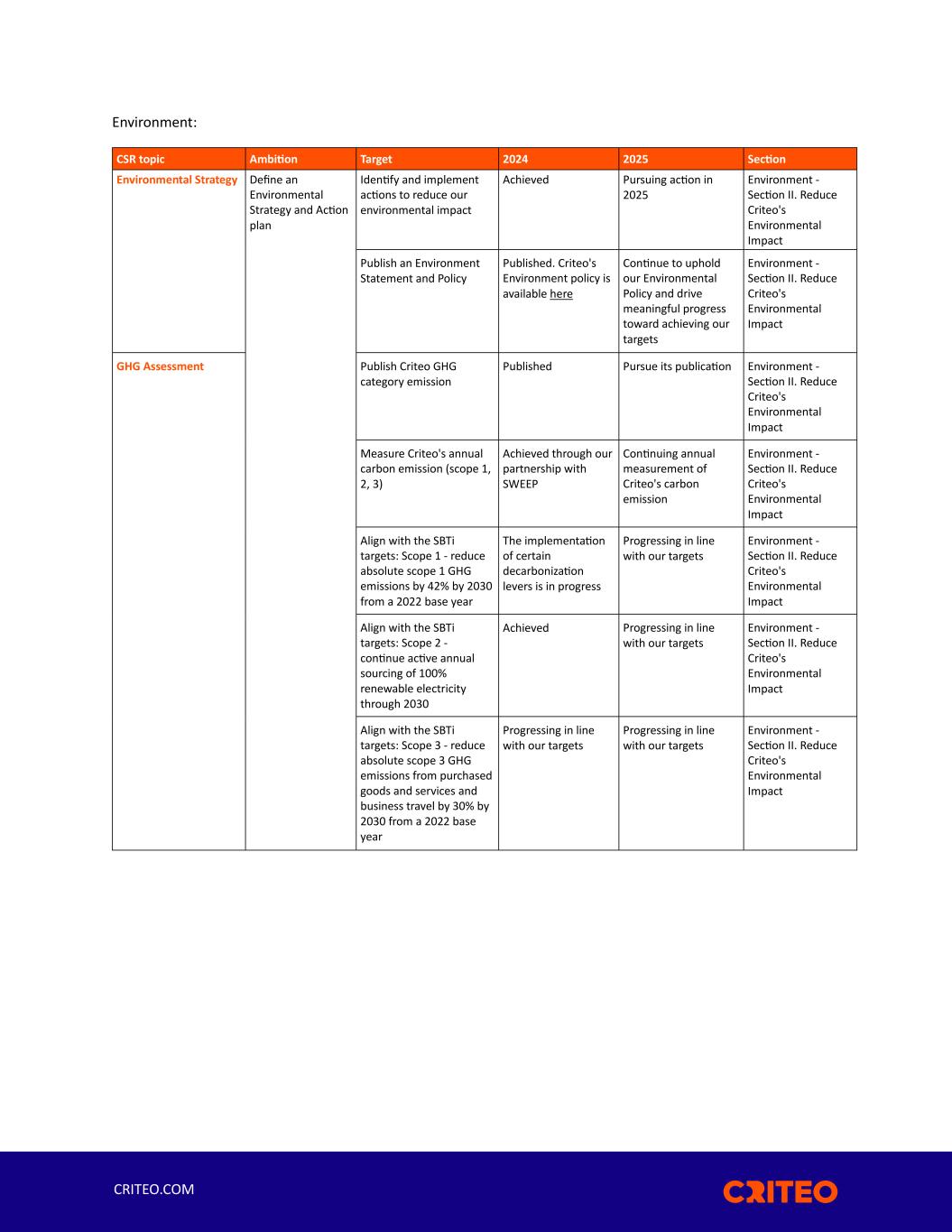 CRITEO.COM Environment: CSR topic Ambition Target 2024 2025 Section Environmental Strategy Define an Environmental Strategy and Action plan Identify and implement actions to reduce our environmental impact Achieved Pursuing action in 2025 Environment - Section II. Reduce Criteo's Environmental Impact Publish an Environment Statement and Policy Published. Criteo's Environment policy is available here Continue to uphold our Environmental Policy and drive meaningful progress toward achieving our targets Environment - Section II. Reduce Criteo's Environmental Impact GHG Assessment Publish Criteo GHG category emission Published Pursue its publication Environment - Section II. Reduce Criteo's Environmental Impact Measure Criteo's annual carbon emission (scope 1, 2, 3) Achieved through our partnership with SWEEP Continuing annual measurement of Criteo's carbon emission Environment - Section II. Reduce Criteo's Environmental Impact Align with the SBTi targets: Scope 1 - reduce absolute scope 1 GHG emissions by 42% by 2030 from a 2022 base year The implementation of certain decarbonization levers is in progress Progressing in line with our targets Environment - Section II. Reduce Criteo's Environmental Impact Align with the SBTi targets: Scope 2 - continue active annual sourcing of 100% renewable electricity through 2030 Achieved Progressing in line with our targets Environment - Section II. Reduce Criteo's Environmental Impact Align with the SBTi targets: Scope 3 - reduce absolute scope 3 GHG emissions from purchased goods and services and business travel by 30% by 2030 from a 2022 base year Progressing in line with our targets Progressing in line with our targets Environment - Section II. Reduce Criteo's Environmental Impact