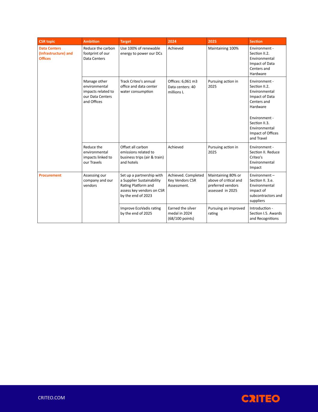 CRITEO.COM CSR topic Ambition Target 2024 2025 Section Data Centers (Infrastructure) and Offices Reduce the carbon footprint of our Data Centers Use 100% of renewable energy to power our DCs Achieved Maintaining 100% Environment - Section II.2. Environmental Impact of Data Centers and Hardware Manage other environmental impacts related to our Data Centers and Offices Track Criteo's annual office and data center water consumption Offices: 6,061 m3 Data centers: 40 millions L Pursuing action in 2025 Environment - Section II.2. Environmental Impact of Data Centers and Hardware Environment - Section II.3. Environmental Impact of Offices and Travel Reduce the environmental impacts linked to our Travels Offset all carbon emissions related to business trips (air & train) and hotels Achieved Pursuing action in 2025 Environment - Section II. Reduce Criteo's Environmental Impact Procurement Assessing our company and our vendors Set up a partnership with a Supplier Sustainability Rating Platform and assess key vendors on CSR by the end of 2023 Achieved. Completed Key Vendors CSR Assessment. Maintaining 80% or above of critical and preferred vendors assessed in 2025 Environment – Section II. 3.e. Environmental impact of subcontractors and suppliers Improve EcoVadis rating by the end of 2025 Earned the silver medal in 2024 (68/100 points) Pursuing an improved rating Introduction - Section I.5. Awards and Recognitions