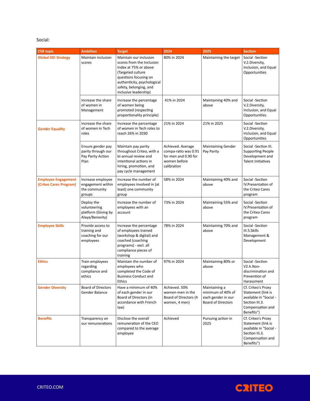 CRITEO.COM Social: CSR topic Ambition Target 2024 2025 Section Global DEI Strategy Maintain inclusion scores Maintain our inclusion scores from the Inclusion Index at 75% or above (Targeted culture questions focusing on authenticity, psychological safety, belonging, and inclusive leadership) 80% in 2024 Maintaining the target Social -Section V.2.Diversity, Inclusion, and Equal Opportunities Increase the share of women in Management Increase the percentage of women being promoted (respecting proportionality principle) 41% in 2024 Maintaining 40% and above Social -Section V.2.Diversity, Inclusion, and Equal Opportunities Gender Equality Increase the share of women in Tech roles Increase the percentage of women in Tech roles to reach 26% in 2030 21% in 2024 21% in 2025 Social -Section V.2.Diversity, Inclusion, and Equal Opportunities Ensure gender pay parity through our Pay Parity Action Plan Maintain pay parity throughout Criteo, with a bi-annual review and intentional actions in hiring, promotion, and pay cycle management Achieved. Average compa-ratio was 0.91 for men and 0.90 for women before calibration Maintaining Gender Pay Parity Social -Section III. Supporting People Development and Talent Initiatives Employee Engagement (Criteo Cares Program) Increase employee engagement within the community groups Increase the number of employees involved in (at least) one community group 58% in 2024 Maintaining 40% and above Social -Section IV.Presentation of the Criteo Cares program Deploy the volunteering platform (Giving by Alaya/Benevity) Increase the number of employees with an account 73% in 2024 Maintaining 55% and above Social -Section IV.Presentation of the Criteo Cares program Employee Skills Provide access to training and coaching for our employees Increase the percentage of employees trained (workshop & digital) and coached (coaching programs) - excl. all compliance pieces of training 78% in 2024 Maintaining 70% and above Social -Section III.5.Skills Management & Development Ethics Train employees regarding compliance and ethics Maintain the number of employees who completed the Code of Business Conduct and Ethics 97% in 2024 Maintaining 80% or above Social -Section V2.h.Non- discrimination and Prevention of Harassment Gender Diversity Board of Directors Gender Balance Have a minimum of 40% of each gender in our Board of Directors (in accordance with French law) Achieved. 50% women-men in the Board of Directors (4 women, 4 men) Maintaining a minimum of 40% of each gender in our Board of Directors Cf. Criteo's Proxy Statement (link is available in "Social - Section III.3. Compensation and Benefits") Benefits Transparency on our remunerations Disclose the overall remuneration of the CEO compared to the average employee Achieved Pursuing action in 2025 Cf. Criteo's Proxy Statement (link is available in "Social - Section III.3. Compensation and Benefits")