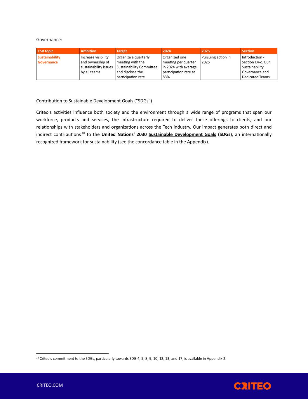 CRITEO.COM Governance: CSR topic Ambition Target 2024 2025 Section Sustainability Governance Increase visibility and ownership of sustainability issues by all teams Organize a quarterly meeting with the Sustainability Committee and disclose the participation rate Organized one meeting per quarter in 2024 with average participation rate at 83% Pursuing action in 2025 Introduction - Section I.4-c. Our Sustainability Governance and Dedicated Teams Contribution to Sustainable Development Goals ("SDGs") Criteo's activities influence both society and the environment through a wide range of programs that span our workforce, products and services, the infrastructure required to deliver these offerings to clients, and our relationships with stakeholders and organizations across the Tech industry. Our impact generates both direct and indirect contributions17F 18 to the United Nations' 2030 Sustainable Development Goals (SDGs), an internationally recognized framework for sustainability (see the concordance table in the Appendix). 18 Criteo's commitment to the SDGs, particularly towards SDG 4, 5, 8, 9, 10, 12, 13, and 17, is available in Appendix 2.