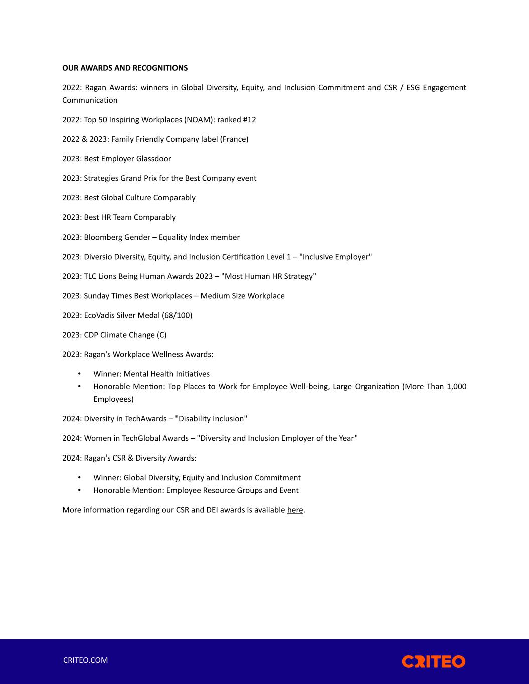 CRITEO.COM OUR AWARDS AND RECOGNITIONS 2022: Ragan Awards: winners in Global Diversity, Equity, and Inclusion Commitment and CSR / ESG Engagement Communication 2022: Top 50 Inspiring Workplaces (NOAM): ranked #12 2022 & 2023: Family Friendly Company label (France) 2023: Best Employer Glassdoor 2023: Strategies Grand Prix for the Best Company event 2023: Best Global Culture Comparably 2023: Best HR Team Comparably 2023: Bloomberg Gender – Equality Index member 2023: Diversio Diversity, Equity, and Inclusion Certification Level 1 – "Inclusive Employer" 2023: TLC Lions Being Human Awards 2023 – "Most Human HR Strategy" 2023: Sunday Times Best Workplaces – Medium Size Workplace 2023: EcoVadis Silver Medal (68/100) 2023: CDP Climate Change (C) 2023: Ragan's Workplace Wellness Awards: • Winner: Mental Health Initiatives • Honorable Mention: Top Places to Work for Employee Well-being, Large Organization (More Than 1,000 Employees) 2024: Diversity in TechAwards – "Disability Inclusion" 2024: Women in TechGlobal Awards – "Diversity and Inclusion Employer of the Year" 2024: Ragan's CSR & Diversity Awards: • Winner: Global Diversity, Equity and Inclusion Commitment • Honorable Mention: Employee Resource Groups and Event More information regarding our CSR and DEI awards is available here.