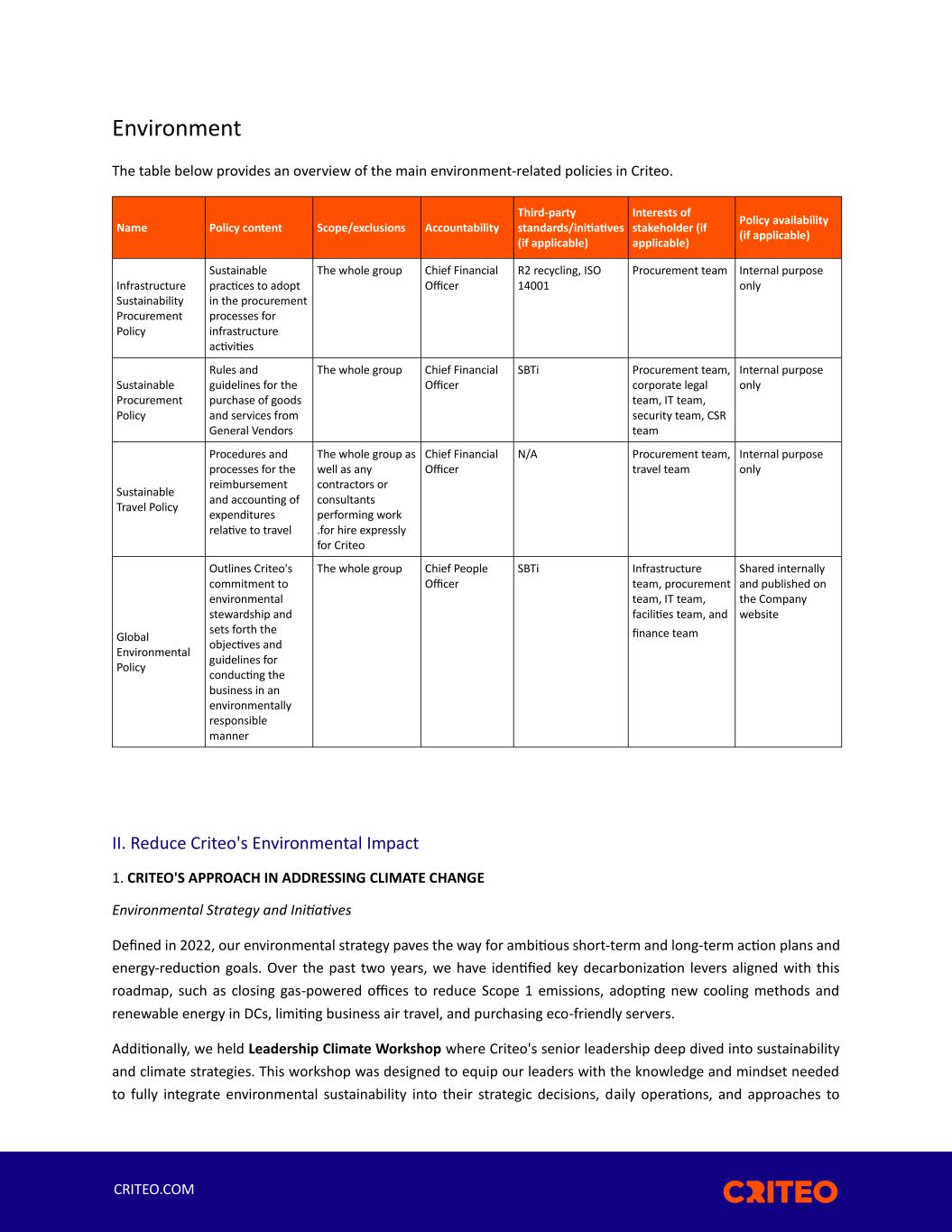 CRITEO.COM Environment The table below provides an overview of the main environment-related policies in Criteo. Name Policy content Scope/exclusions Accountability Third-party standards/initiatives (if applicable) Interests of stakeholder (if applicable) Policy availability (if applicable) Infrastructure Sustainability Procurement Policy Sustainable practices to adopt in the procurement processes for infrastructure activities The whole group Chief Financial Officer R2 recycling, ISO 14001 Procurement team Internal purpose only Sustainable Procurement Policy Rules and guidelines for the purchase of goods and services from General Vendors The whole group Chief Financial Officer SBTi Procurement team, corporate legal team, IT team, security team, CSR team Internal purpose only Sustainable Travel Policy Procedures and processes for the reimbursement and accounting of expenditures relative to travel The whole group as well as any contractors or consultants performing work .for hire expressly for Criteo Chief Financial Officer N/A Procurement team, travel team Internal purpose only Global Environmental Policy Outlines Criteo's commitment to environmental stewardship and sets forth the objectives and guidelines for conducting the business in an environmentally responsible manner The whole group Chief People Officer SBTi Infrastructure team, procurement team, IT team, facilities team, and finance team Shared internally and published on the Company website II. Reduce Criteo's Environmental Impact 1. CRITEO'S APPROACH IN ADDRESSING CLIMATE CHANGE Environmental Strategy and Initiatives Defined in 2022, our environmental strategy paves the way for ambitious short-term and long-term action plans and energy-reduction goals. Over the past two years, we have identified key decarbonization levers aligned with this roadmap, such as closing gas-powered offices to reduce Scope 1 emissions, adopting new cooling methods and renewable energy in DCs, limiting business air travel, and purchasing eco-friendly servers. Additionally, we held Leadership Climate Workshop where Criteo's senior leadership deep dived into sustainability and climate strategies. This workshop was designed to equip our leaders with the knowledge and mindset needed to fully integrate environmental sustainability into their strategic decisions, daily operations, and approaches to