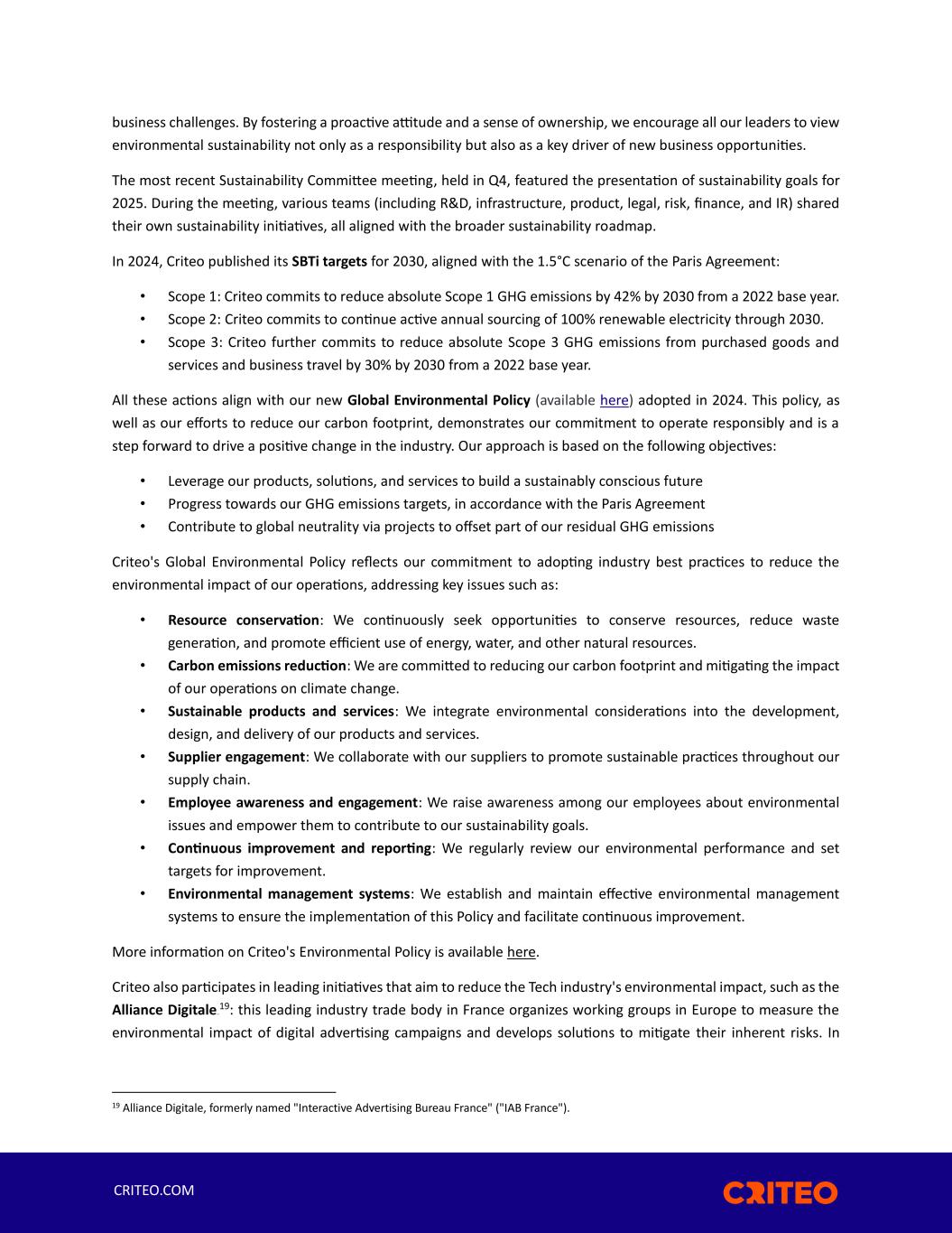 CRITEO.COM business challenges. By fostering a proactive attitude and a sense of ownership, we encourage all our leaders to view environmental sustainability not only as a responsibility but also as a key driver of new business opportunities. The most recent Sustainability Committee meeting, held in Q4, featured the presentation of sustainability goals for 2025. During the meeting, various teams (including R&D, infrastructure, product, legal, risk, finance, and IR) shared their own sustainability initiatives, all aligned with the broader sustainability roadmap. In 2024, Criteo published its SBTi targets for 2030, aligned with the 1.5°C scenario of the Paris Agreement: • Scope 1: Criteo commits to reduce absolute Scope 1 GHG emissions by 42% by 2030 from a 2022 base year. • Scope 2: Criteo commits to continue active annual sourcing of 100% renewable electricity through 2030. • Scope 3: Criteo further commits to reduce absolute Scope 3 GHG emissions from purchased goods and services and business travel by 30% by 2030 from a 2022 base year. All these actions align with our new Global Environmental Policy (available here) adopted in 2024. This policy, as well as our efforts to reduce our carbon footprint, demonstrates our commitment to operate responsibly and is a step forward to drive a positive change in the industry. Our approach is based on the following objectives: • Leverage our products, solutions, and services to build a sustainably conscious future • Progress towards our GHG emissions targets, in accordance with the Paris Agreement • Contribute to global neutrality via projects to offset part of our residual GHG emissions Criteo's Global Environmental Policy reflects our commitment to adopting industry best practices to reduce the environmental impact of our operations, addressing key issues such as: • Resource conservation: We continuously seek opportunities to conserve resources, reduce waste generation, and promote efficient use of energy, water, and other natural resources. • Carbon emissions reduction: We are committed to reducing our carbon footprint and mitigating the impact of our operations on climate change. • Sustainable products and services: We integrate environmental considerations into the development, design, and delivery of our products and services. • Supplier engagement: We collaborate with our suppliers to promote sustainable practices throughout our supply chain. • Employee awareness and engagement: We raise awareness among our employees about environmental issues and empower them to contribute to our sustainability goals. • Continuous improvement and reporting: We regularly review our environmental performance and set targets for improvement. • Environmental management systems: We establish and maintain effective environmental management systems to ensure the implementation of this Policy and facilitate continuous improvement. More information on Criteo's Environmental Policy is available here. Criteo also participates in leading initiatives that aim to reduce the Tech industry's environmental impact, such as the Alliance Digitale1 8F 19: this leading industry trade body in France organizes working groups in Europe to measure the environmental impact of digital advertising campaigns and develops solutions to mitigate their inherent risks. In 19 Alliance Digitale, formerly named "Interactive Advertising Bureau France" ("IAB France").