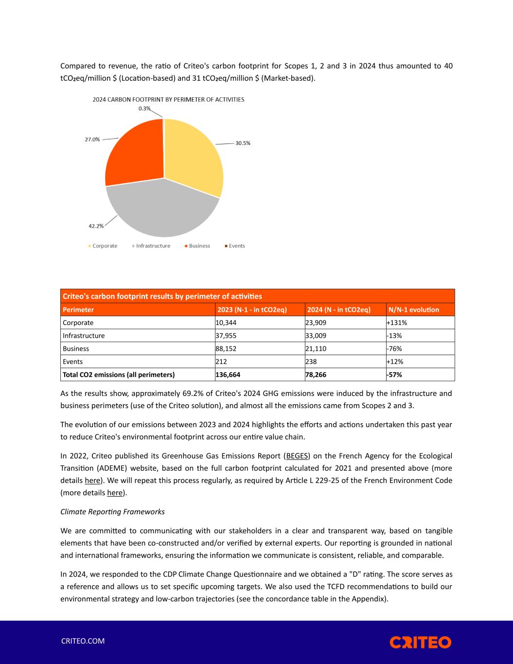 CRITEO.COM Compared to revenue, the ratio of Criteo's carbon footprint for Scopes 1, 2 and 3 in 2024 thus amounted to 40 tCO2eq/million $ (Location-based) and 31 tCO2eq/million $ (Market-based). Criteo's carbon footprint results by perimeter of activities Perimeter 2023 (N-1 - in tCO2eq) 2024 (N - in tCO2eq) N/N-1 evolution Corporate 10,344 23,909 +131% Infrastructure 37,955 33,009 -13% Business 88,152 21,110 -76% Events 212 238 +12% Total CO2 emissions (all perimeters) 136,664 78,266 -57% As the results show, approximately 69.2% of Criteo's 2024 GHG emissions were induced by the infrastructure and business perimeters (use of the Criteo solution), and almost all the emissions came from Scopes 2 and 3. The evolution of our emissions between 2023 and 2024 highlights the efforts and actions undertaken this past year to reduce Criteo's environmental footprint across our entire value chain. In 2022, Criteo published its Greenhouse Gas Emissions Report (BEGES) on the French Agency for the Ecological Transition (ADEME) website, based on the full carbon footprint calculated for 2021 and presented above (more details here). We will repeat this process regularly, as required by Article L 229-25 of the French Environment Code (more details here). Climate Reporting Frameworks We are committed to communicating with our stakeholders in a clear and transparent way, based on tangible elements that have been co-constructed and/or verified by external experts. Our reporting is grounded in national and international frameworks, ensuring the information we communicate is consistent, reliable, and comparable. In 2024, we responded to the CDP Climate Change Questionnaire and we obtained a "D" rating. The score serves as a reference and allows us to set specific upcoming targets. We also used the TCFD recommendations to build our environmental strategy and low-carbon trajectories (see the concordance table in the Appendix).