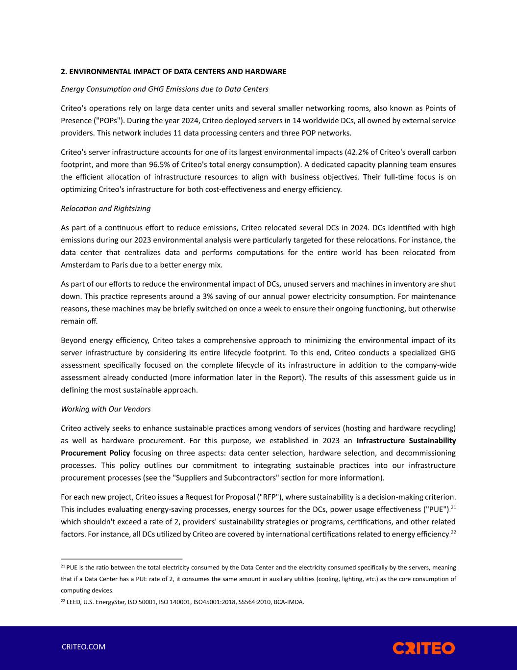 CRITEO.COM 2. ENVIRONMENTAL IMPACT OF DATA CENTERS AND HARDWARE Energy Consumption and GHG Emissions due to Data Centers Criteo's operations rely on large data center units and several smaller networking rooms, also known as Points of Presence ("POPs"). During the year 2024, Criteo deployed servers in 14 worldwide DCs, all owned by external service providers. This network includes 11 data processing centers and three POP networks. Criteo's server infrastructure accounts for one of its largest environmental impacts (42.2% of Criteo's overall carbon footprint, and more than 96.5% of Criteo's total energy consumption). A dedicated capacity planning team ensures the efficient allocation of infrastructure resources to align with business objectives. Their full-time focus is on optimizing Criteo's infrastructure for both cost-effectiveness and energy efficiency. Relocation and Rightsizing As part of a continuous effort to reduce emissions, Criteo relocated several DCs in 2024. DCs identified with high emissions during our 2023 environmental analysis were particularly targeted for these relocations. For instance, the data center that centralizes data and performs computations for the entire world has been relocated from Amsterdam to Paris due to a better energy mix. As part of our efforts to reduce the environmental impact of DCs, unused servers and machines in inventory are shut down. This practice represents around a 3% saving of our annual power electricity consumption. For maintenance reasons, these machines may be briefly switched on once a week to ensure their ongoing functioning, but otherwise remain off. Beyond energy efficiency, Criteo takes a comprehensive approach to minimizing the environmental impact of its server infrastructure by considering its entire lifecycle footprint. To this end, Criteo conducts a specialized GHG assessment specifically focused on the complete lifecycle of its infrastructure in addition to the company-wide assessment already conducted (more information later in the Report). The results of this assessment guide us in defining the most sustainable approach. Working with Our Vendors Criteo actively seeks to enhance sustainable practices among vendors of services (hosting and hardware recycling) as well as hardware procurement. For this purpose, we established in 2023 an Infrastructure Sustainability Procurement Policy focusing on three aspects: data center selection, hardware selection, and decommissioning processes. This policy outlines our commitment to integrating sustainable practices into our infrastructure procurement processes (see the "Suppliers and Subcontractors" section for more information). For each new project, Criteo issues a Request for Proposal ("RFP"), where sustainability is a decision-making criterion. This includes evaluating energy-saving processes, energy sources for the DCs, power usage effectiveness ("PUE") 2 0F 21 which shouldn't exceed a rate of 2, providers' sustainability strategies or programs, certifications, and other related factors. For instance, all DCs utilized by Criteo are covered by international certifications related to energy efficiency 21F 22 21 PUE is the ratio between the total electricity consumed by the Data Center and the electricity consumed specifically by the servers, meaning that if a Data Center has a PUE rate of 2, it consumes the same amount in auxiliary utilities (cooling, lighting, etc.) as the core consumption of computing devices. 22 LEED, U.S. EnergyStar, ISO 50001, ISO 140001, ISO45001:2018, SS564:2010, BCA-IMDA.