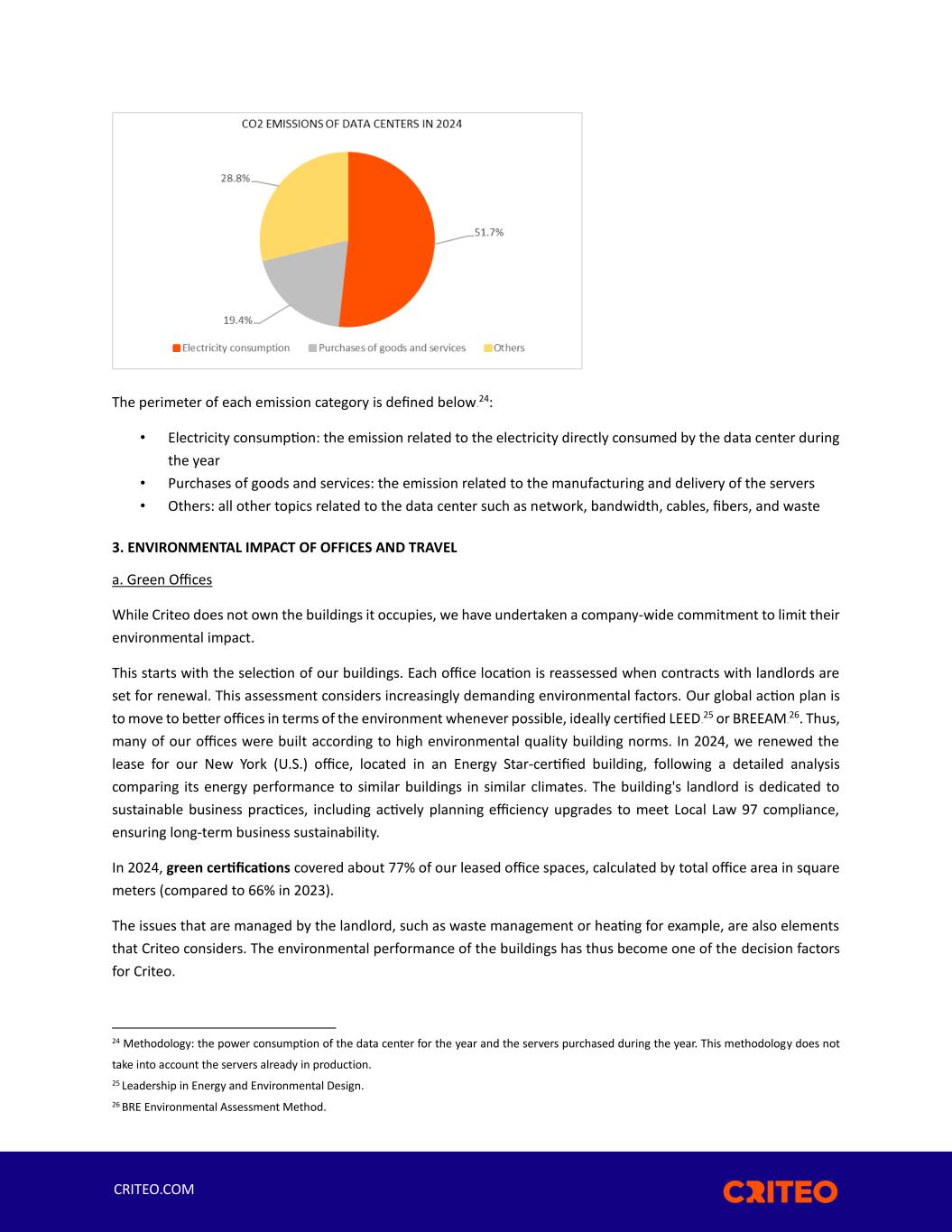 CRITEO.COM The perimeter of each emission category is defined below 23F 24: • Electricity consumption: the emission related to the electricity directly consumed by the data center during the year • Purchases of goods and services: the emission related to the manufacturing and delivery of the servers • Others: all other topics related to the data center such as network, bandwidth, cables, fibers, and waste 3. ENVIRONMENTAL IMPACT OF OFFICES AND TRAVEL a. Green Offices While Criteo does not own the buildings it occupies, we have undertaken a company-wide commitment to limit their environmental impact. This starts with the selection of our buildings. Each office location is reassessed when contracts with landlords are set for renewal. This assessment considers increasingly demanding environmental factors. Our global action plan is to move to better offices in terms of the environment whenever possible, ideally certified LEED 24F 25 or BREEAM2 5F 26. Thus, many of our offices were built according to high environmental quality building norms. In 2024, we renewed the lease for our New York (U.S.) office, located in an Energy Star-certified building, following a detailed analysis comparing its energy performance to similar buildings in similar climates. The building's landlord is dedicated to sustainable business practices, including actively planning efficiency upgrades to meet Local Law 97 compliance, ensuring long-term business sustainability. In 2024, green certifications covered about 77% of our leased office spaces, calculated by total office area in square meters (compared to 66% in 2023). The issues that are managed by the landlord, such as waste management or heating for example, are also elements that Criteo considers. The environmental performance of the buildings has thus become one of the decision factors for Criteo. 24 Methodology: the power consumption of the data center for the year and the servers purchased during the year. This methodology does not take into account the servers already in production. 25 Leadership in Energy and Environmental Design. 26 BRE Environmental Assessment Method.