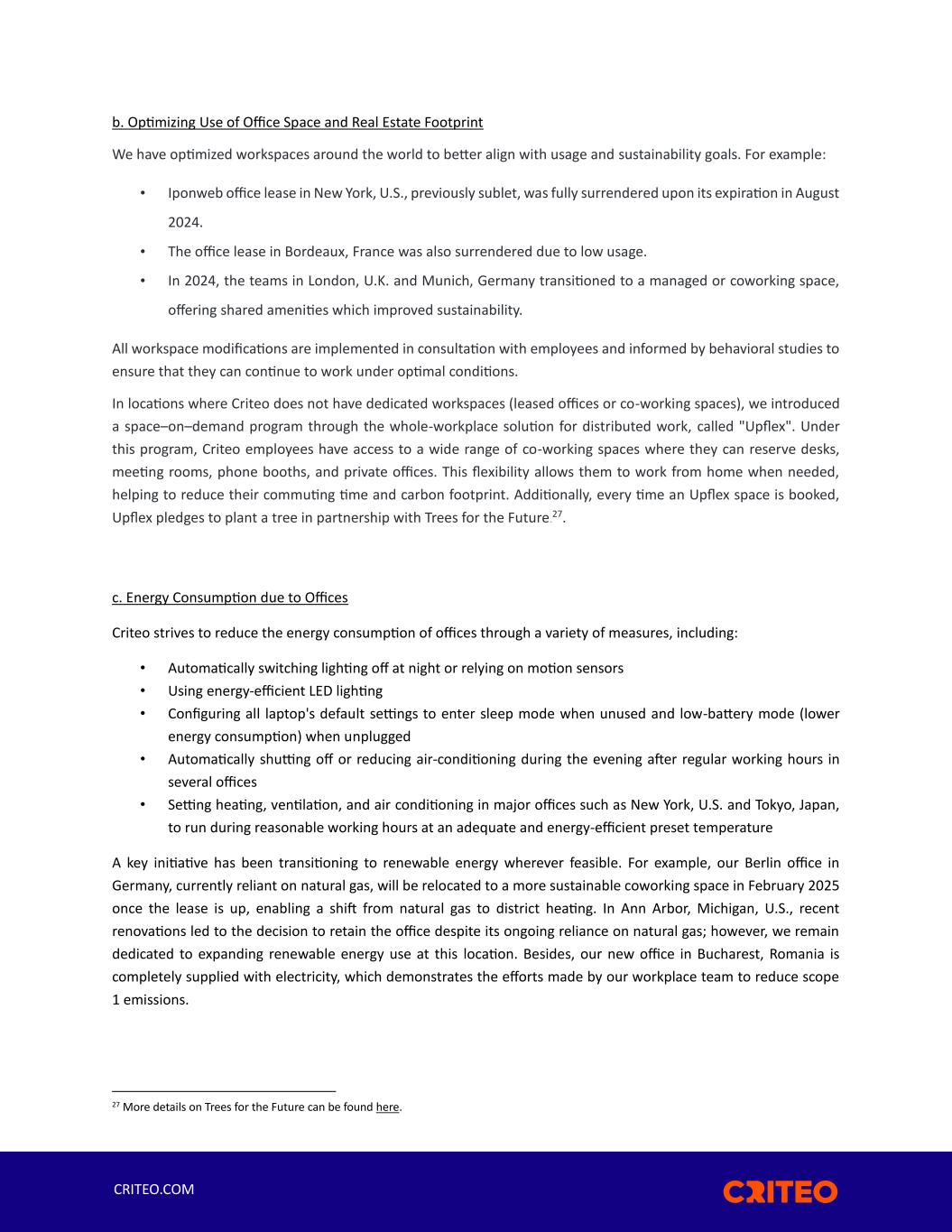 CRITEO.COM b. Optimizing Use of Office Space and Real Estate Footprint We have optimized workspaces around the world to better align with usage and sustainability goals. For example: • Iponweb office lease in New York, U.S., previously sublet, was fully surrendered upon its expiration in August 2024. • The office lease in Bordeaux, France was also surrendered due to low usage. • In 2024, the teams in London, U.K. and Munich, Germany transitioned to a managed or coworking space, offering shared amenities which improved sustainability. All workspace modifications are implemented in consultation with employees and informed by behavioral studies to ensure that they can continue to work under optimal conditions. In locations where Criteo does not have dedicated workspaces (leased offices or co-working spaces), we introduced a space–on–demand program through the whole-workplace solution for distributed work, called "Upflex". Under this program, Criteo employees have access to a wide range of co-working spaces where they can reserve desks, meeting rooms, phone booths, and private offices. This flexibility allows them to work from home when needed, helping to reduce their commuting time and carbon footprint. Additionally, every time an Upflex space is booked, Upflex pledges to plant a tree in partnership with Trees for the Future 26F 27. c. Energy Consumption due to Offices Criteo strives to reduce the energy consumption of offices through a variety of measures, including: • Automatically switching lighting off at night or relying on motion sensors • Using energy-efficient LED lighting • Configuring all laptop's default settings to enter sleep mode when unused and low-battery mode (lower energy consumption) when unplugged • Automatically shutting off or reducing air-conditioning during the evening after regular working hours in several offices • Setting heating, ventilation, and air conditioning in major offices such as New York, U.S. and Tokyo, Japan, to run during reasonable working hours at an adequate and energy-efficient preset temperature A key initiative has been transitioning to renewable energy wherever feasible. For example, our Berlin office in Germany, currently reliant on natural gas, will be relocated to a more sustainable coworking space in February 2025 once the lease is up, enabling a shift from natural gas to district heating. In Ann Arbor, Michigan, U.S., recent renovations led to the decision to retain the office despite its ongoing reliance on natural gas; however, we remain dedicated to expanding renewable energy use at this location. Besides, our new office in Bucharest, Romania is completely supplied with electricity, which demonstrates the efforts made by our workplace team to reduce scope 1 emissions. 27 More details on Trees for the Future can be found here.