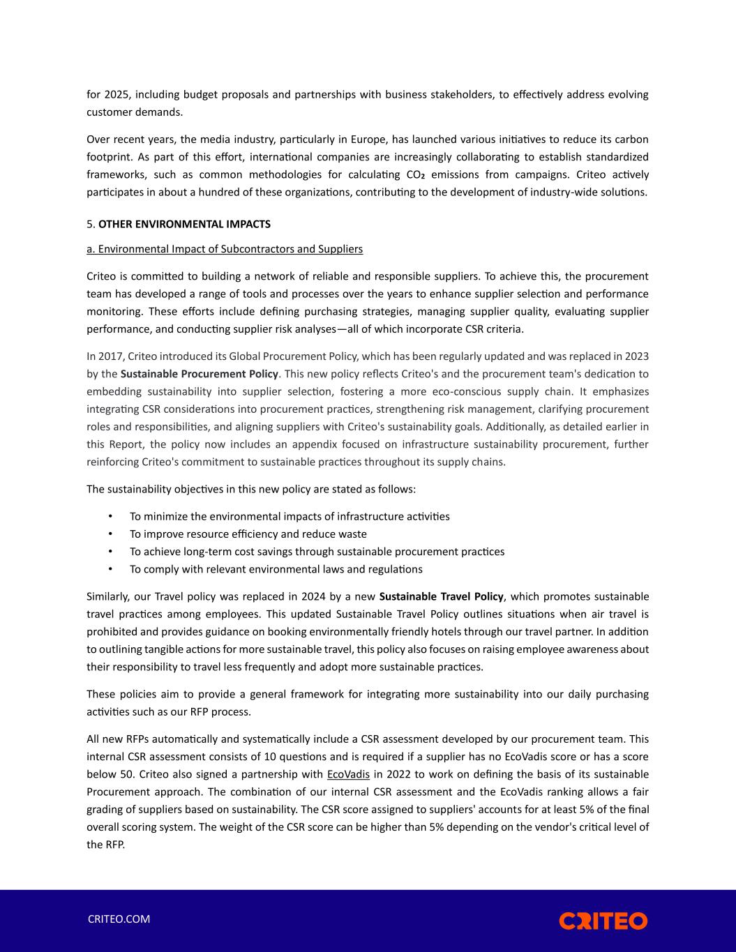 CRITEO.COM for 2025, including budget proposals and partnerships with business stakeholders, to effectively address evolving customer demands. Over recent years, the media industry, particularly in Europe, has launched various initiatives to reduce its carbon footprint. As part of this effort, international companies are increasingly collaborating to establish standardized frameworks, such as common methodologies for calculating CO2 emissions from campaigns. Criteo actively participates in about a hundred of these organizations, contributing to the development of industry-wide solutions. 5. OTHER ENVIRONMENTAL IMPACTS a. Environmental Impact of Subcontractors and Suppliers Criteo is committed to building a network of reliable and responsible suppliers. To achieve this, the procurement team has developed a range of tools and processes over the years to enhance supplier selection and performance monitoring. These efforts include defining purchasing strategies, managing supplier quality, evaluating supplier performance, and conducting supplier risk analyses—all of which incorporate CSR criteria. In 2017, Criteo introduced its Global Procurement Policy, which has been regularly updated and was replaced in 2023 by the Sustainable Procurement Policy. This new policy reflects Criteo's and the procurement team's dedication to embedding sustainability into supplier selection, fostering a more eco-conscious supply chain. It emphasizes integrating CSR considerations into procurement practices, strengthening risk management, clarifying procurement roles and responsibilities, and aligning suppliers with Criteo's sustainability goals. Additionally, as detailed earlier in this Report, the policy now includes an appendix focused on infrastructure sustainability procurement, further reinforcing Criteo's commitment to sustainable practices throughout its supply chains. The sustainability objectives in this new policy are stated as follows: • To minimize the environmental impacts of infrastructure activities • To improve resource efficiency and reduce waste • To achieve long-term cost savings through sustainable procurement practices • To comply with relevant environmental laws and regulations Similarly, our Travel policy was replaced in 2024 by a new Sustainable Travel Policy, which promotes sustainable travel practices among employees. This updated Sustainable Travel Policy outlines situations when air travel is prohibited and provides guidance on booking environmentally friendly hotels through our travel partner. In addition to outlining tangible actions for more sustainable travel, this policy also focuses on raising employee awareness about their responsibility to travel less frequently and adopt more sustainable practices. These policies aim to provide a general framework for integrating more sustainability into our daily purchasing activities such as our RFP process. All new RFPs automatically and systematically include a CSR assessment developed by our procurement team. This internal CSR assessment consists of 10 questions and is required if a supplier has no EcoVadis score or has a score below 50. Criteo also signed a partnership with EcoVadis in 2022 to work on defining the basis of its sustainable Procurement approach. The combination of our internal CSR assessment and the EcoVadis ranking allows a fair grading of suppliers based on sustainability. The CSR score assigned to suppliers' accounts for at least 5% of the final overall scoring system. The weight of the CSR score can be higher than 5% depending on the vendor's critical level of the RFP.