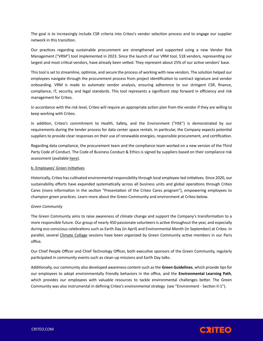 CRITEO.COM The goal is to increasingly include CSR criteria into Criteo's vendor selection process and to engage our supplier network in this transition. Our practices regarding sustainable procurement are strengthened and supported using a new Vendor Risk Management ("VRM") tool implemented in 2023. Since the launch of our VRM tool, 518 vendors, representing our largest and most critical vendors, have already been vetted. They represent about 25% of our active vendors' base. This tool is set to streamline, optimize, and secure the process of working with new vendors. The solution helped our employees navigate through the procurement process from project identification to contract signature and vendor onboarding. VRM is made to automate vendor analysis, ensuring adherence to our stringent CSR, finance, compliance, IT, security, and legal standards. This tool represents a significant step forward in efficiency and risk management for Criteo. In accordance with the risk level, Criteo will require an appropriate action plan from the vendor if they are willing to keep working with Criteo. In addition, Criteo's commitment to Health, Safety, and the Environment ("HSE") is demonstrated by our requirements during the tender process for data center space rentals. In particular, the Company expects potential suppliers to provide clear responses on their use of renewable energies, responsible procurement, and certification. Regarding data compliance, the procurement team and the compliance team worked on a new version of the Third Party Code of Conduct. The Code of Business Conduct & Ethics is signed by suppliers based on their compliance risk assessment (available here). b. Employees' Green Initiatives Historically, Criteo has cultivated environmental responsibility through local employee-led initiatives. Since 2020, our sustainability efforts have expanded systematically across all business units and global operations through Criteo Cares (more information in the section "Presentation of the Criteo Cares program"), empowering employees to champion green practices. Learn more about the Green Community and environment at Criteo below. Green Community The Green Community aims to raise awareness of climate change and support the Company's transformation to a more responsible future. Our group of nearly 450 passionate volunteers is active throughout the year, and especially during eco-conscious celebrations such as Earth Day (in April) and Environmental Month (in September) at Criteo. In parallel, several Climate Collage sessions have been organized by Green Community active members in our Paris office. Our Chief People Officer and Chief Technology Officer, both executive sponsors of the Green Community, regularly participated in community events such as clean-up missions and Earth Day talks. Additionally, our community also developed awareness content such as the Green Guidelines, which provide tips for our employees to adopt environmentally friendly behaviors in the office, and the Environmental Learning Path, which provides our employees with valuable resources to tackle environmental challenges better. The Green Community was also instrumental in defining Criteo's environmental strategy (see "Environment - Section II-1").